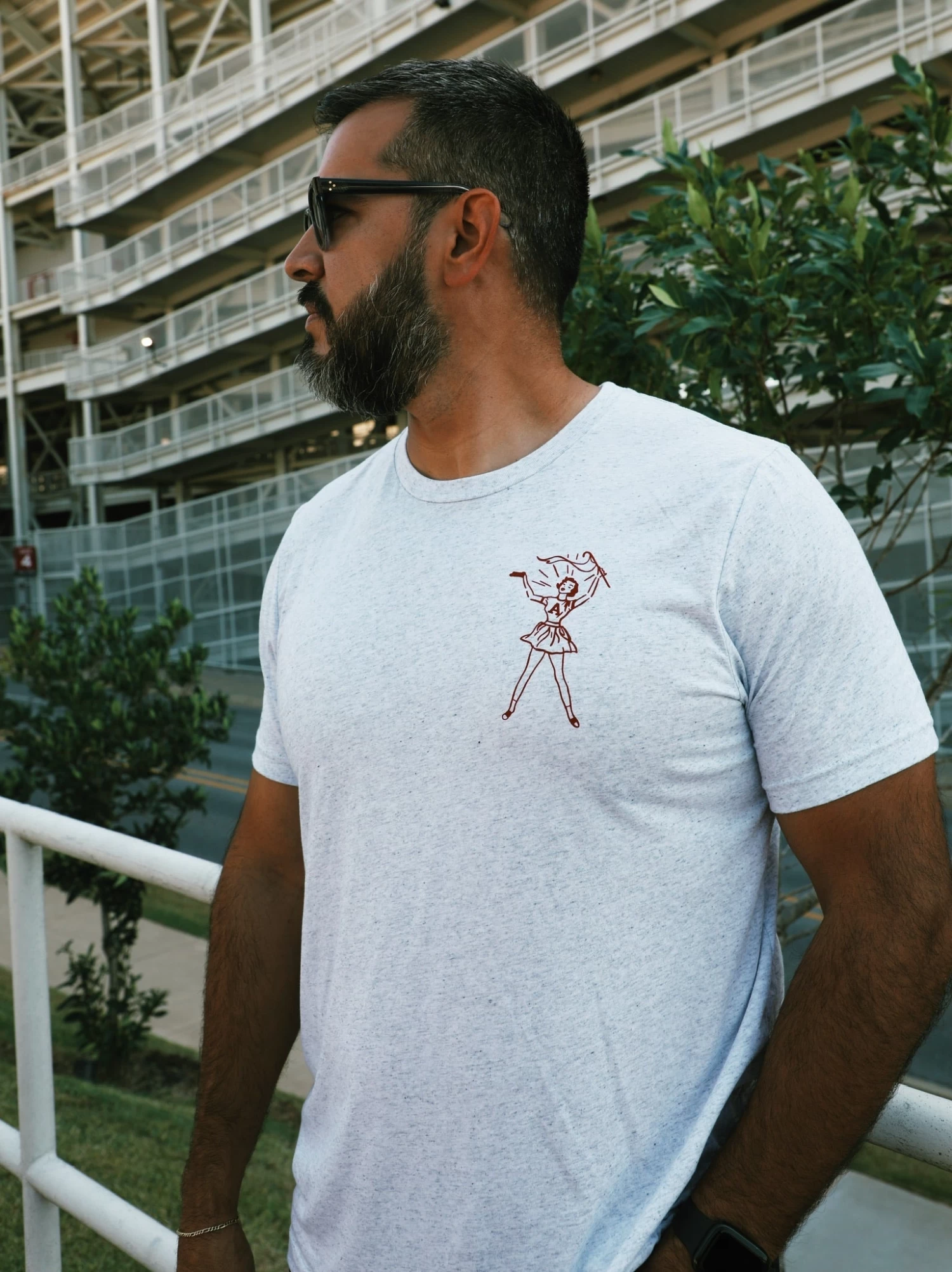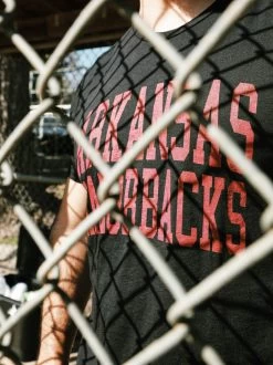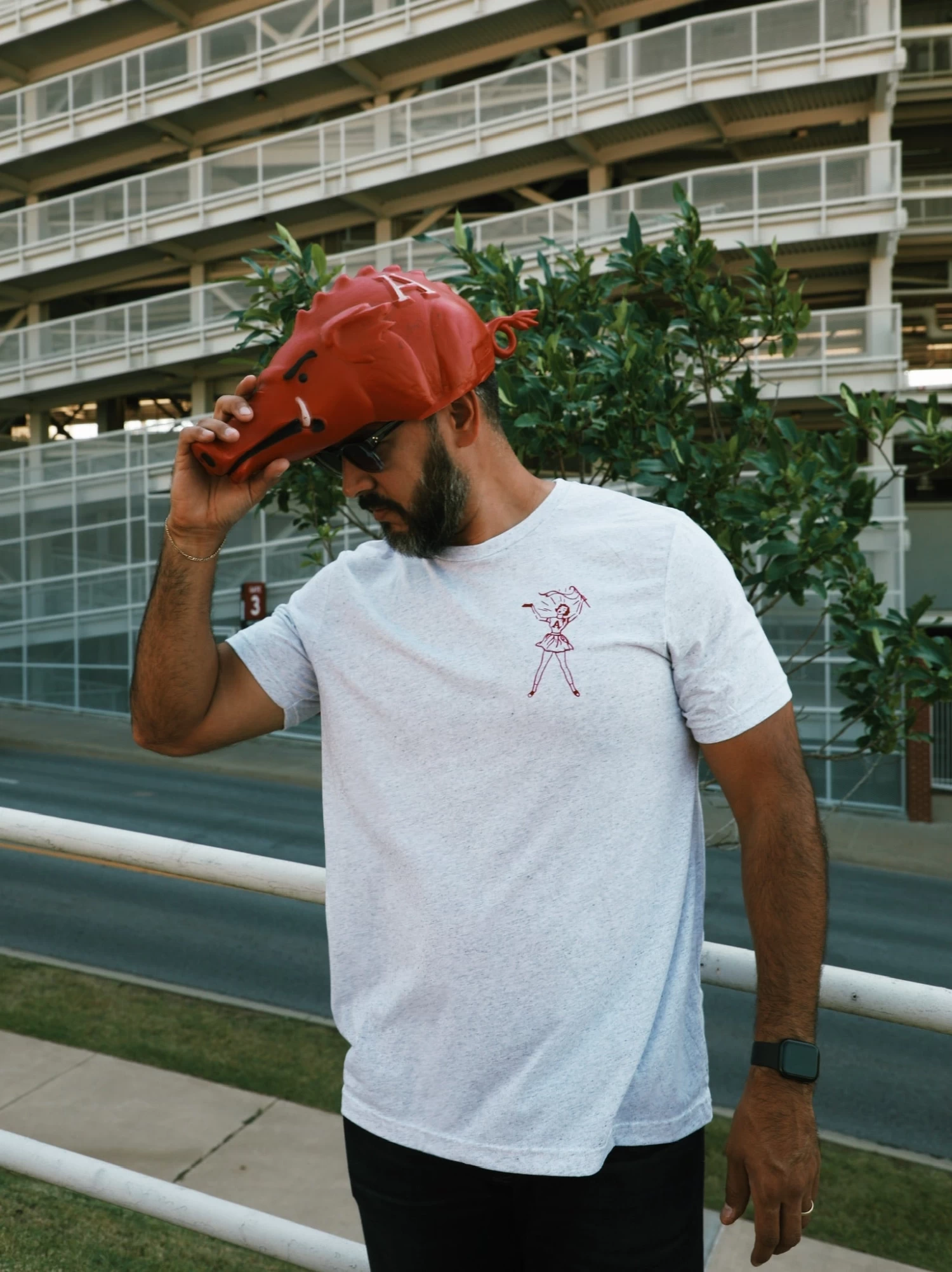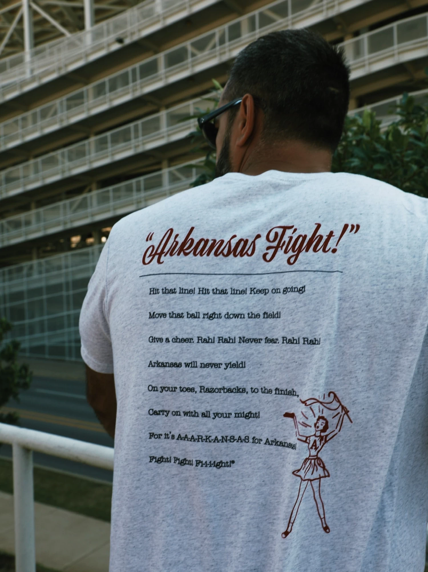 Show off your Arkansas pride with the Arkansas fight song t-shirt! This shirt features a cheerleader on the left breast and the back has the Arkansas fight song!