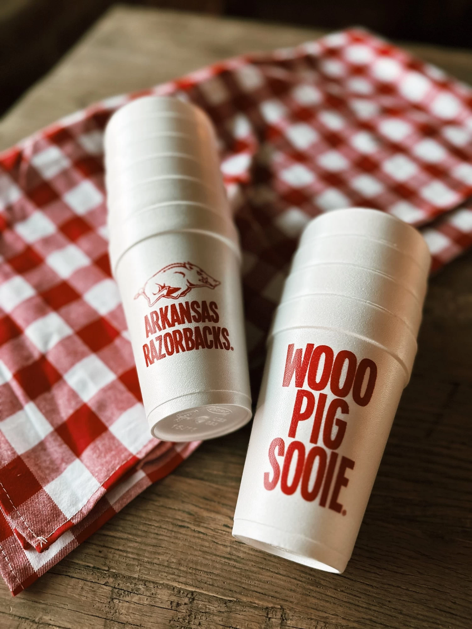 A cute and affordable addition to your Razorback gameday celebration or graduation party – cute Wooo Pig Sooie celebrating the University of Arkansas styrofoam cups.