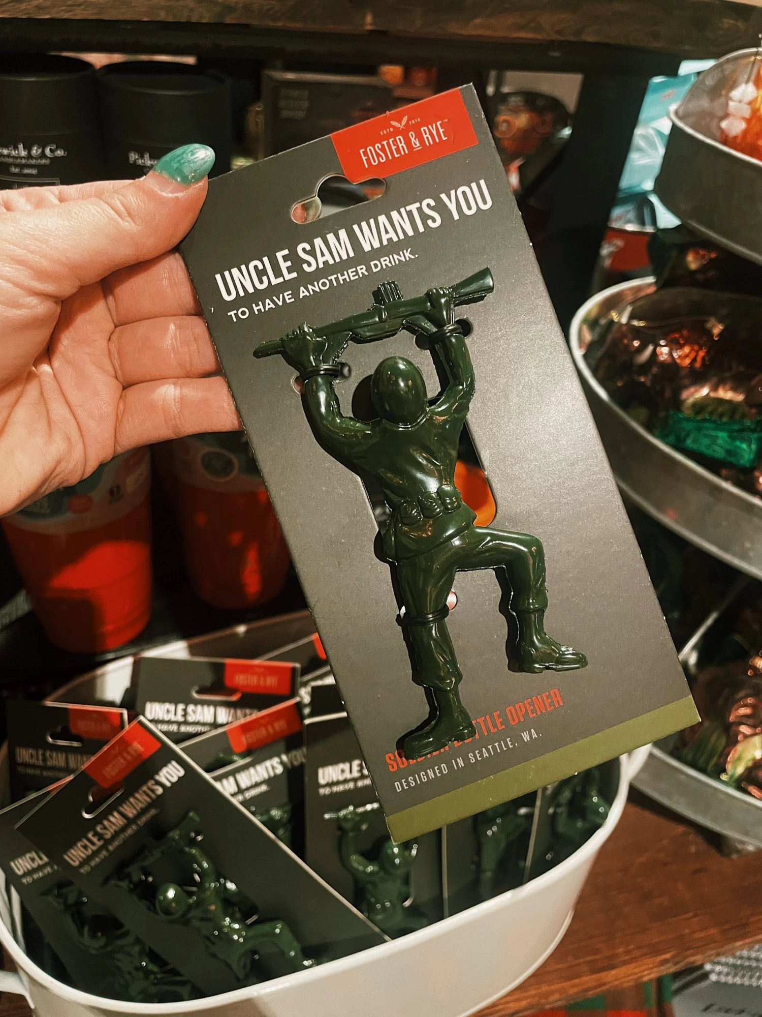 -Dodge the draft. Go for a bottle instead. Our army-inspired bottle opener is ready to battle caps at a minute’s notice – just brace his rifle under the cap’s edge and leverage him to pop tops on the double, soldier.—-The ultimate big kid drinking companion–Ready to battle any beer cap–Zinc alloy construction–Army green finish–Makes a great gift–