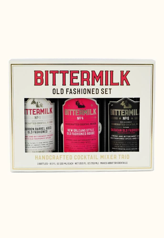 A fresh look on our favorite gift set. An old fashioned, three ways — get all three Bittermilk old fashioned style cocktail mixers with the Old Fashioned Set cocktail mixer trio. Packaged in a foil stamped box, it makes a great gift.
