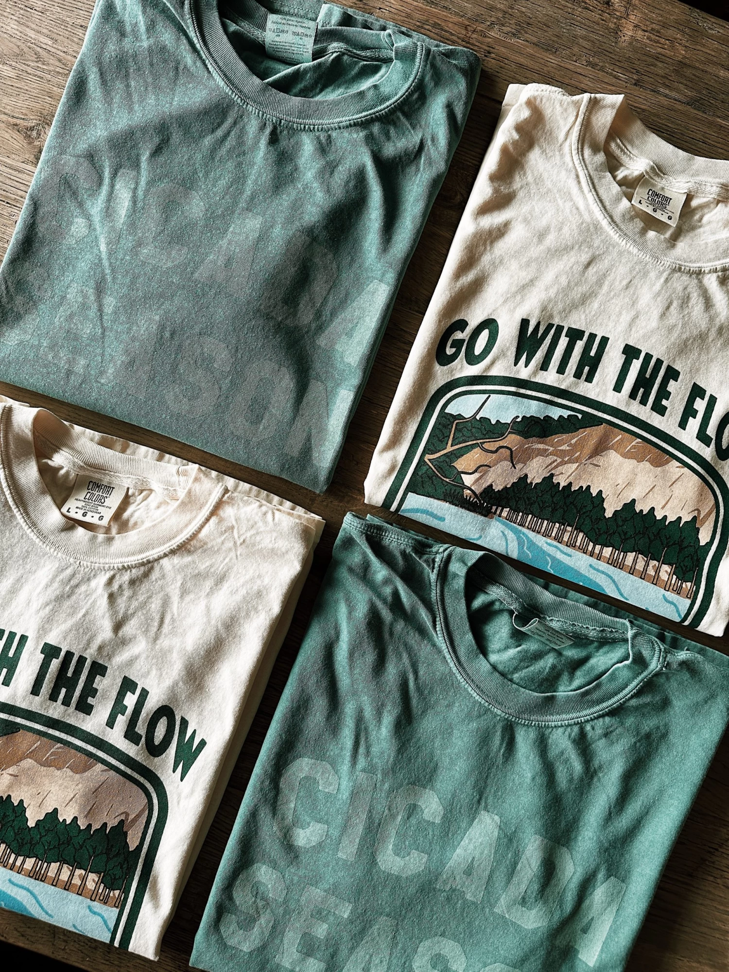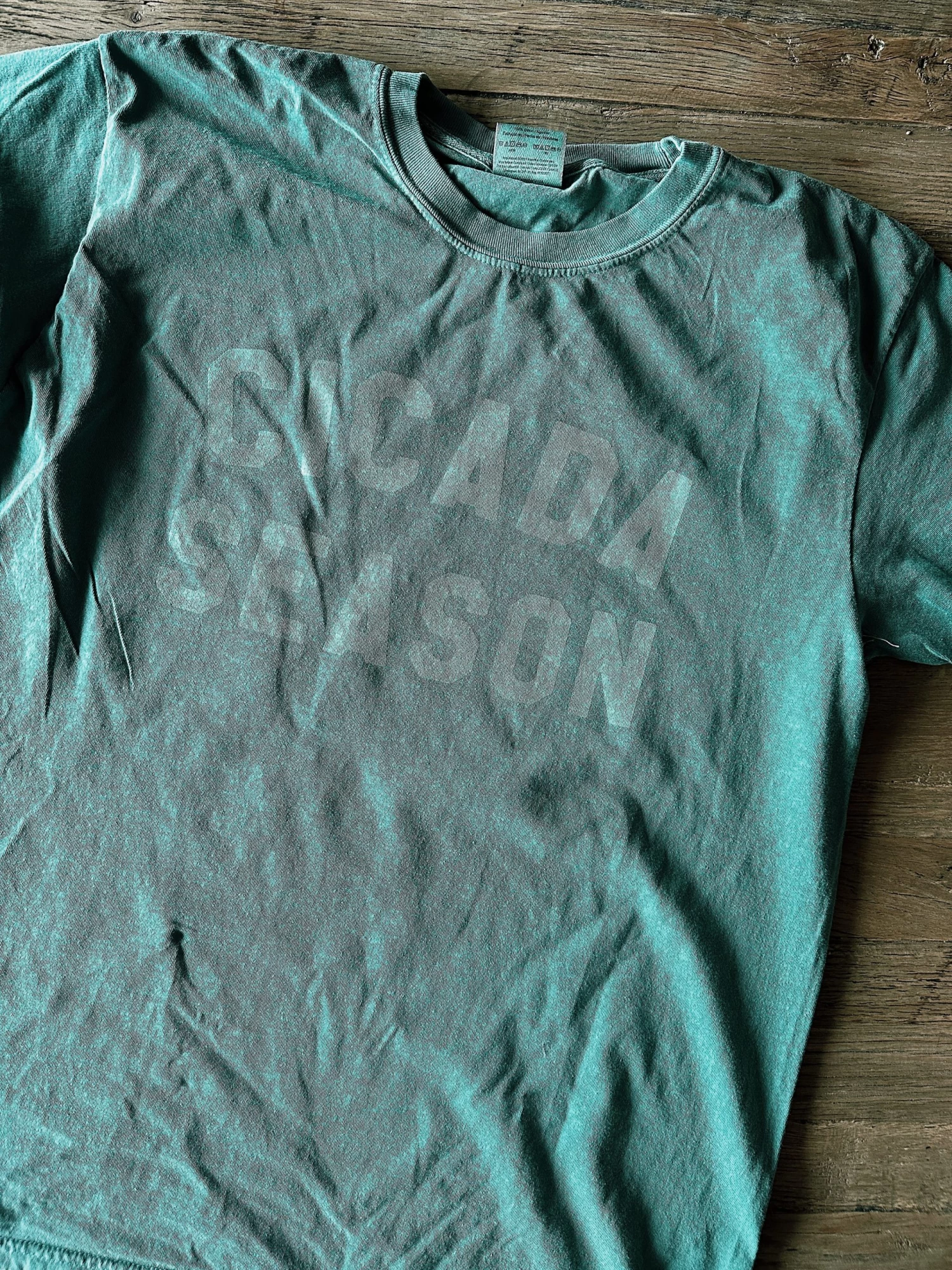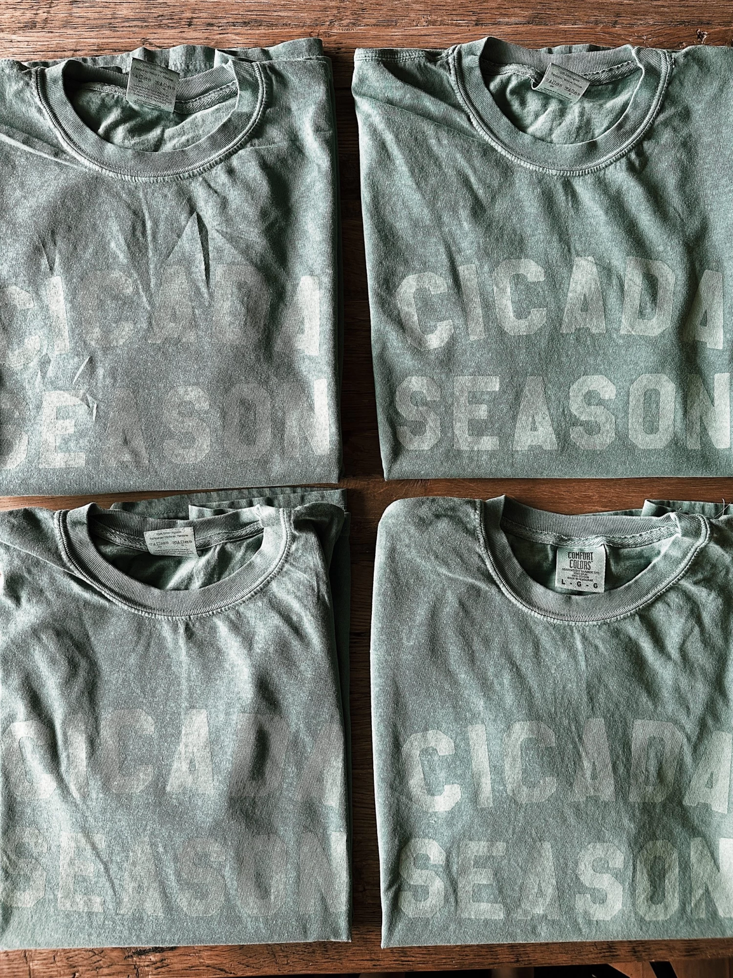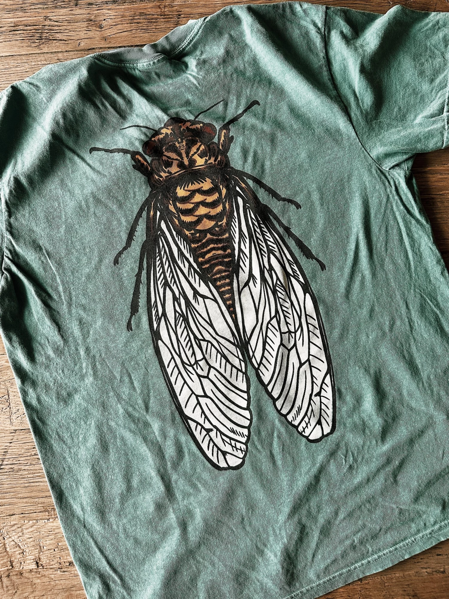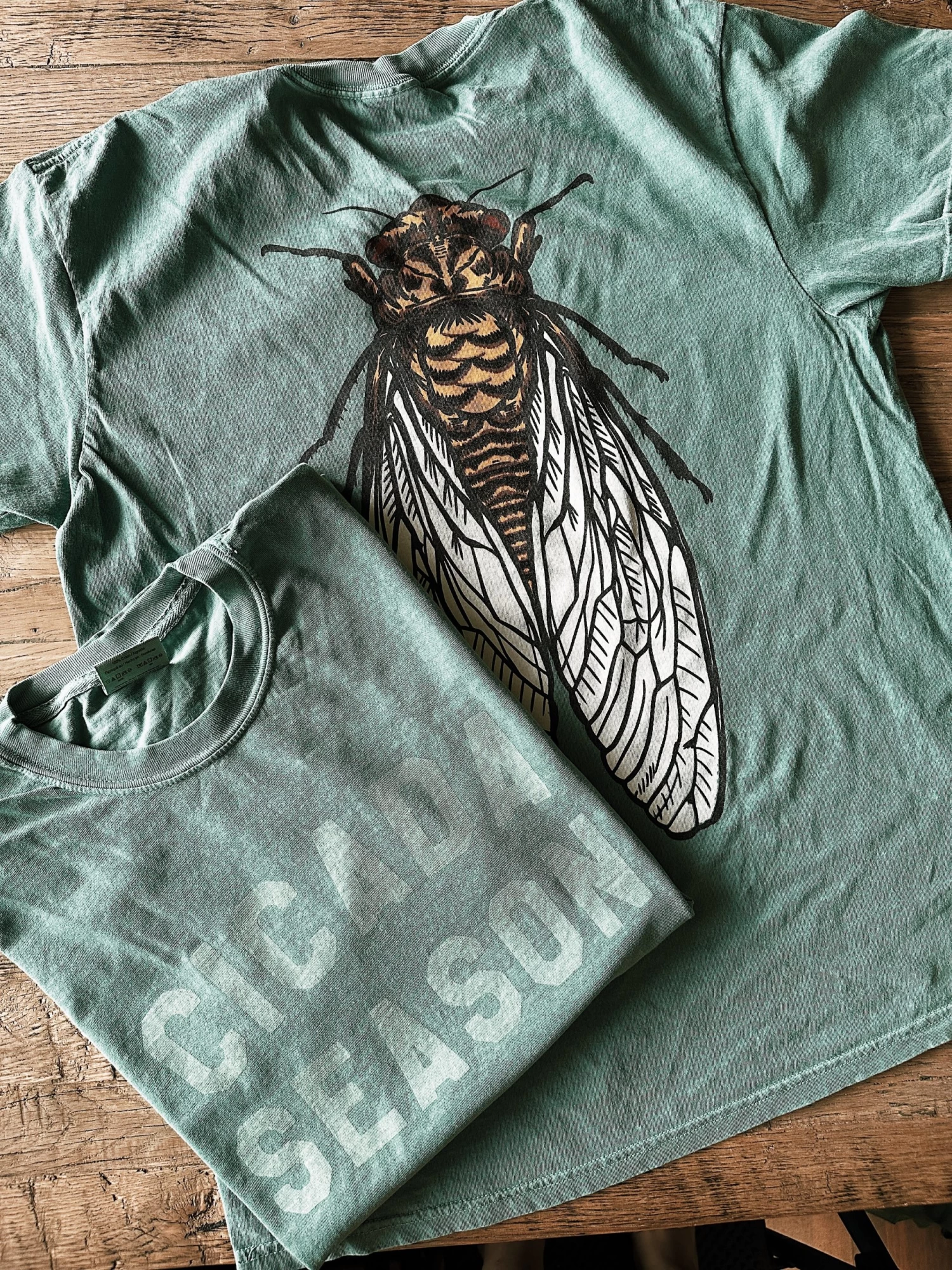It’s Cicada Season in Arkansas! This green t-shirt features the phrase “Cicada Season” in light green font on the front on the shirt. On the back, there is a giant cicada in multicolor ink.