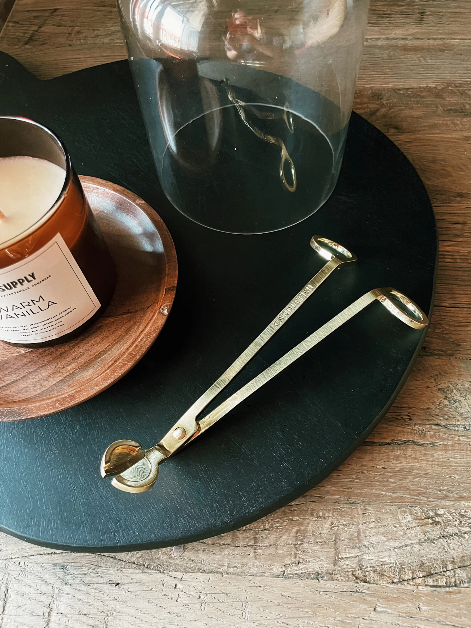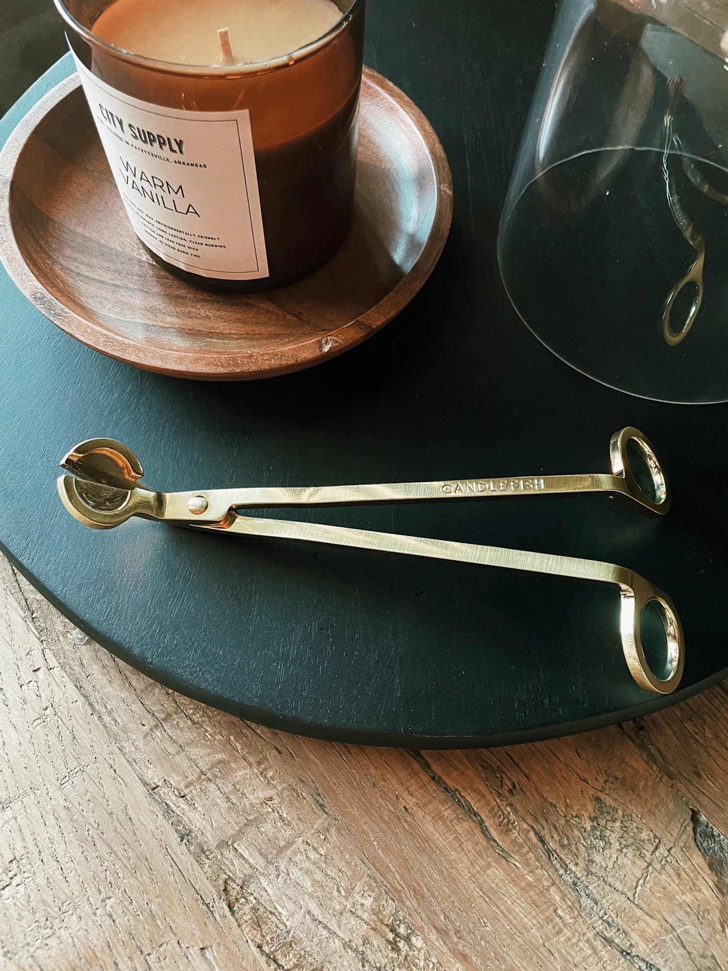 Keep your wick healthy and your candles burning clean with our gold wick trimmer. -Brushed gold in color with engraved Candlefish logo
