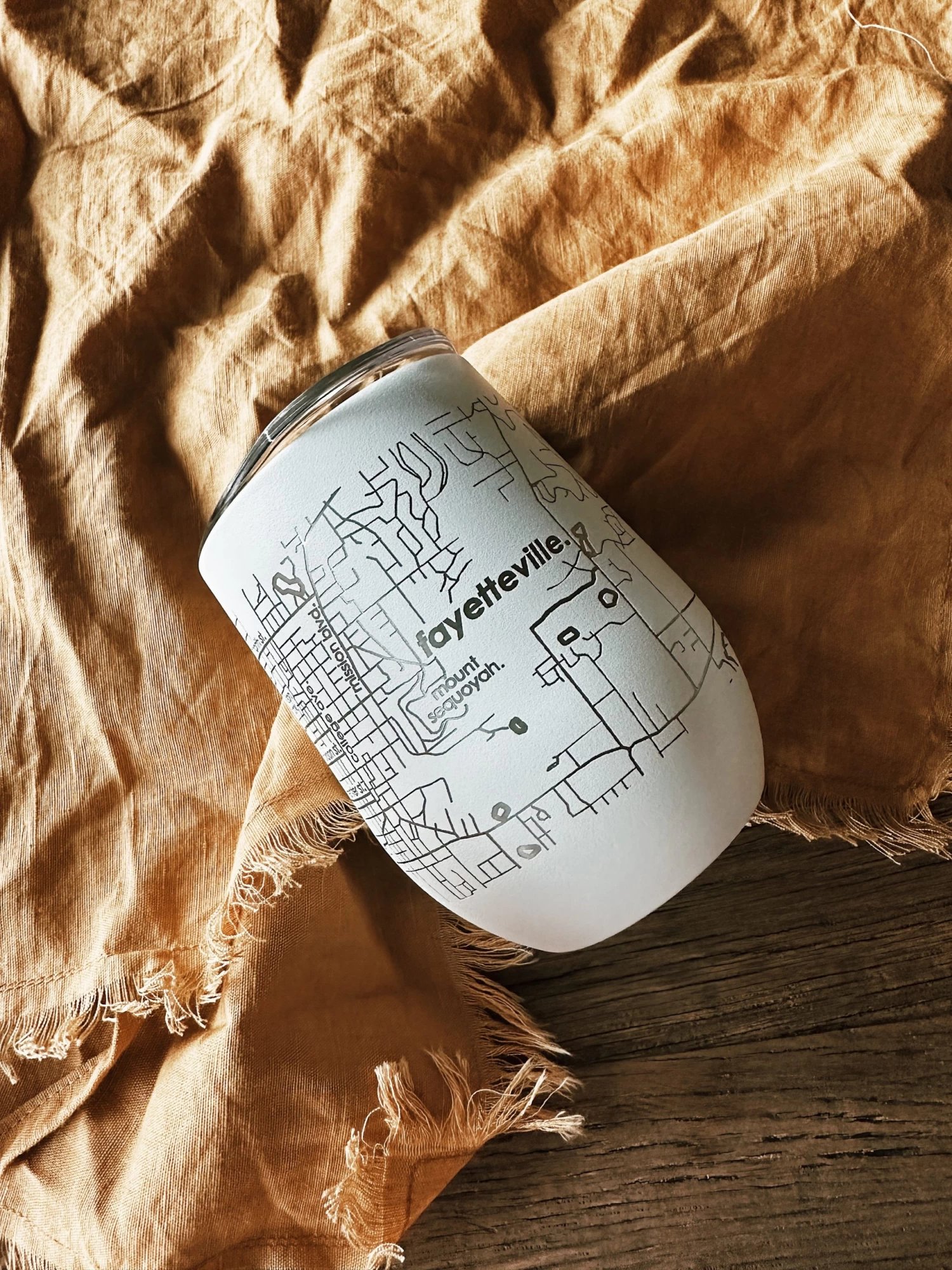 Our Map Drinkware and Glassware collections are available for every U.S. city and town! Stay refreshed and inspired with our engraved Fayetteville AR Map 12 oz. Insulated Wine Tumbler with lid. Each tumbler is triple-wall vacuum-insulated for maximum temperature retention and comes precision-etched entirely around the vessel with a detailed map of your favorite city’s streets, neighborhoods, and coordinates. Available in Matte White