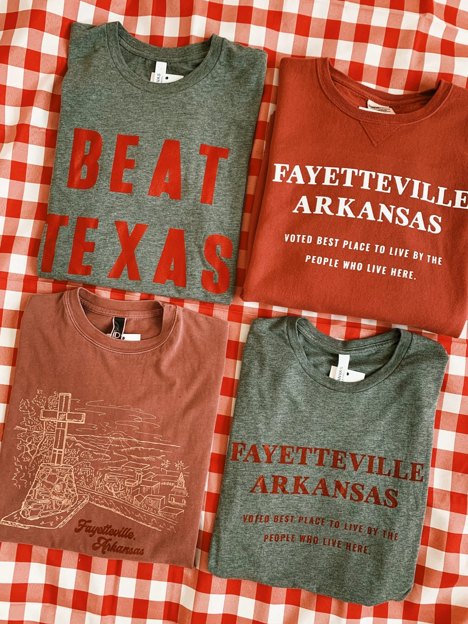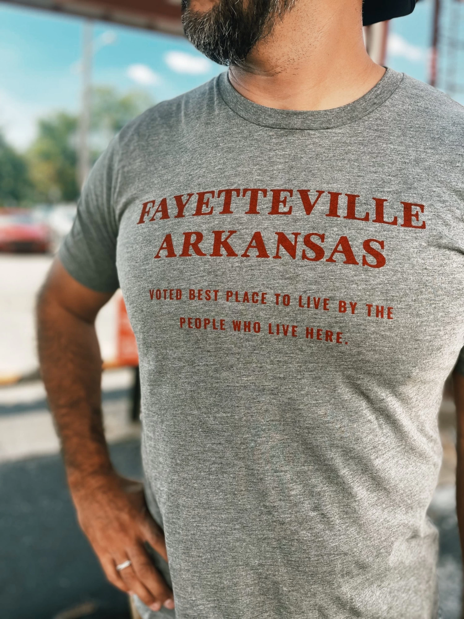 Grab this tee to show your love for Fayetteville Arkansas. It features a gray colored fabric with red graphic font.Â