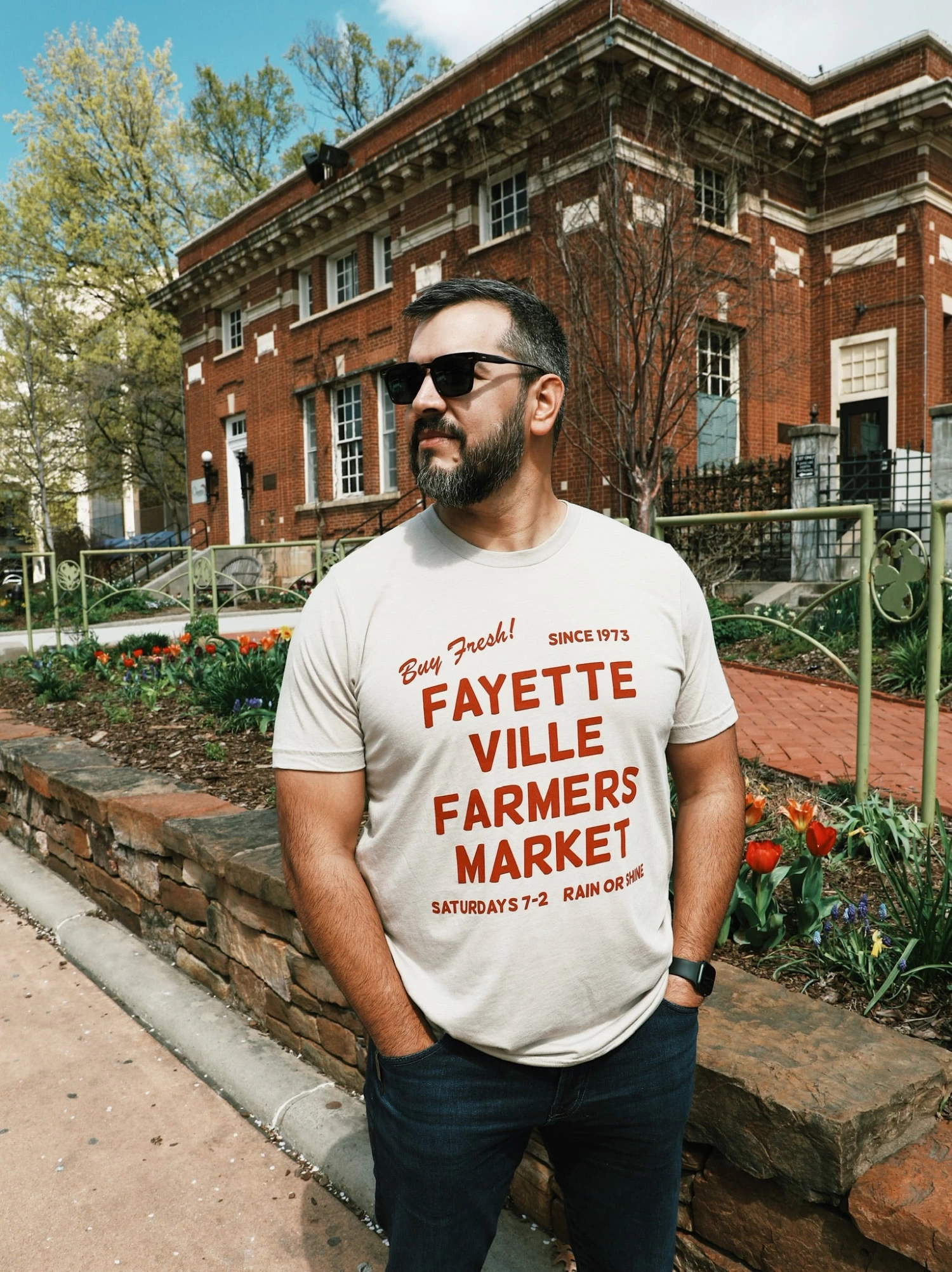 This super soft tee is perfect for your next trip to the Fayetteville Farmers Market. The light tan tee has red ink that says “Buy Fresh! Since 1973 Fayetteville Farmers Market Saturdays 7-2 Rain or Shine.”