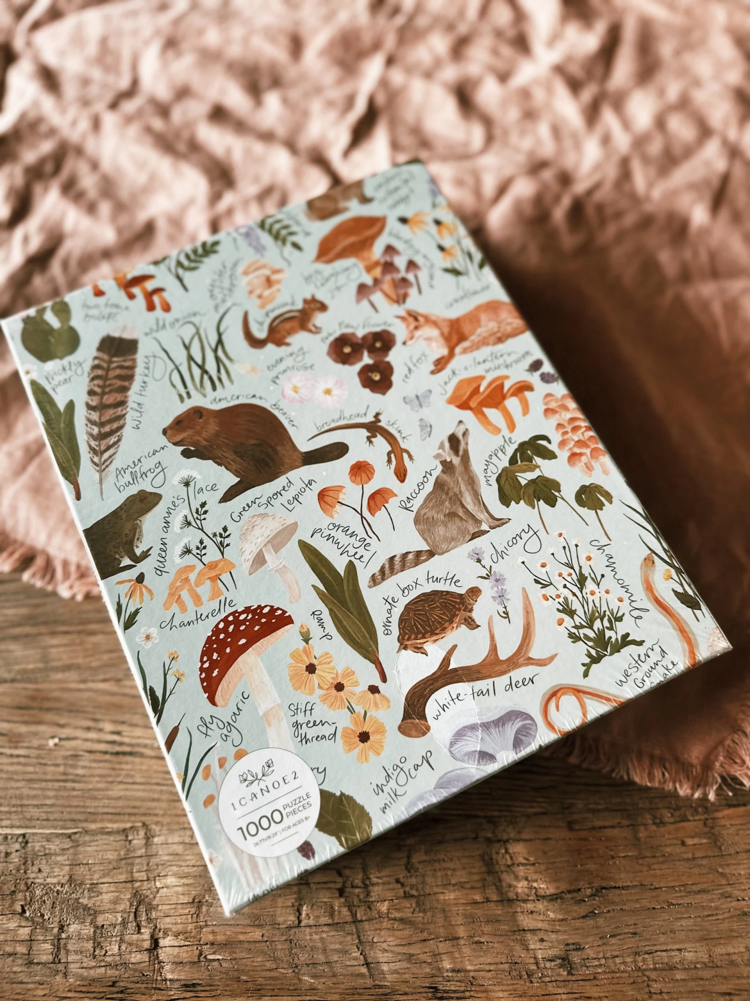 Our Flora and Fauna puzzle makes the perfect gift for plant and animal lovers or anyone who loves exploring nature, botany and the great outdoors! It features a variety of beautifully hand-painted animals, flowers and plants such as mushrooms, blackberries, coneflowers, chamomile, a turtle, fox, raccoon (this little feller is our personal fave), beaver, frog, snake, chipmunk, and lizard. You’ll even spot a few butterflies and a prickly pear cactus! Each species’ name is hand-lettered—making this puzzle a fun and educational activity for kids and adults.