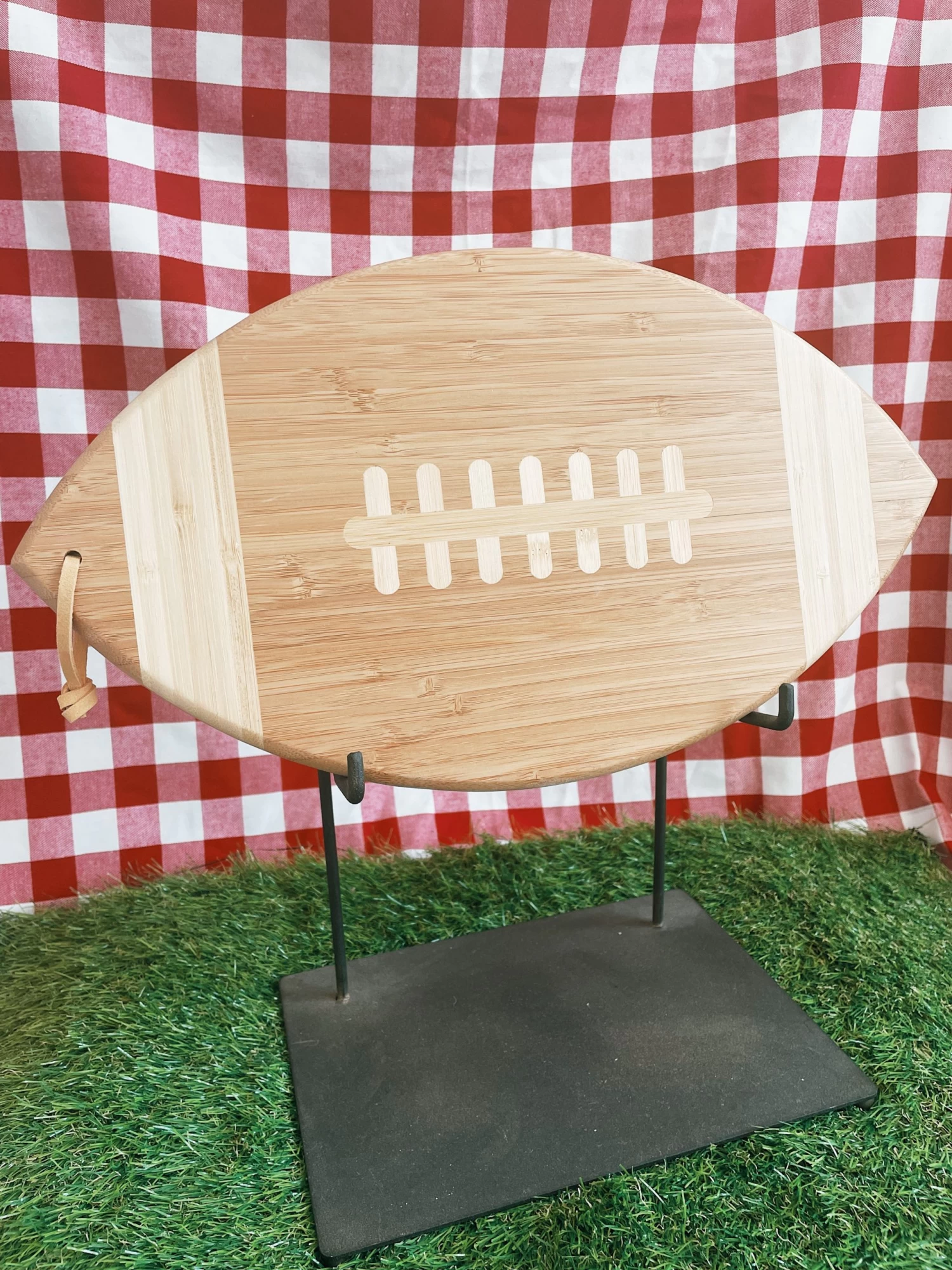 Gear your store up for game day with our Football Board! The board is beautiful designed with lighter bamboo representing the laces and familiar stripes of a pig skin. This board is ideal for pairing with tailgate assortments or just as a gift item for those that love the game. It includes a hang tie to easily double as a décor piece as well.