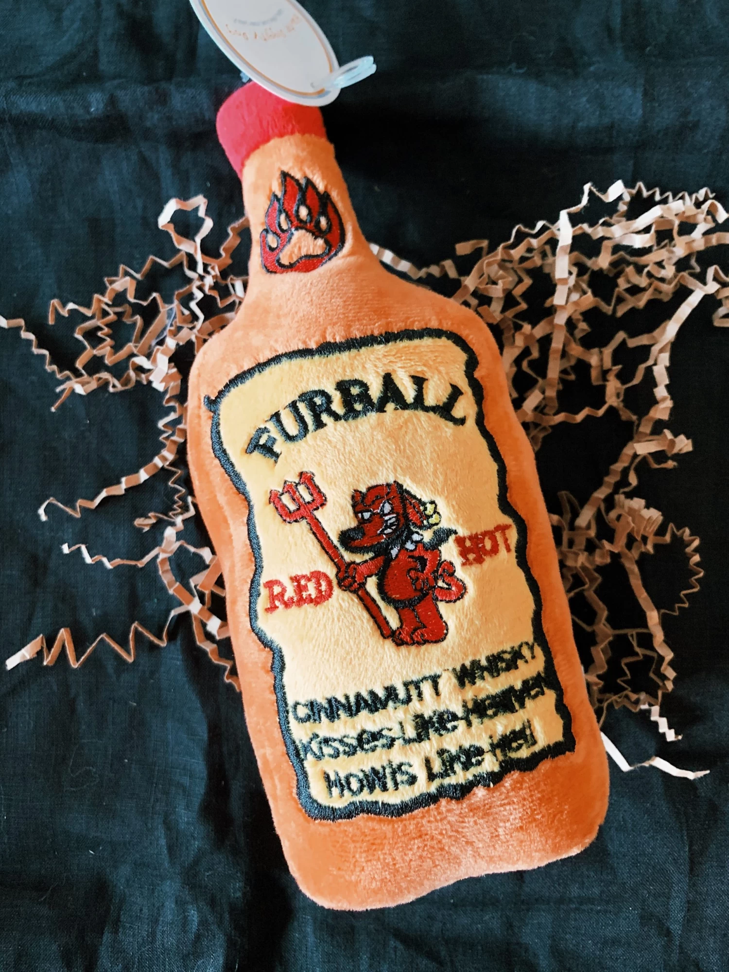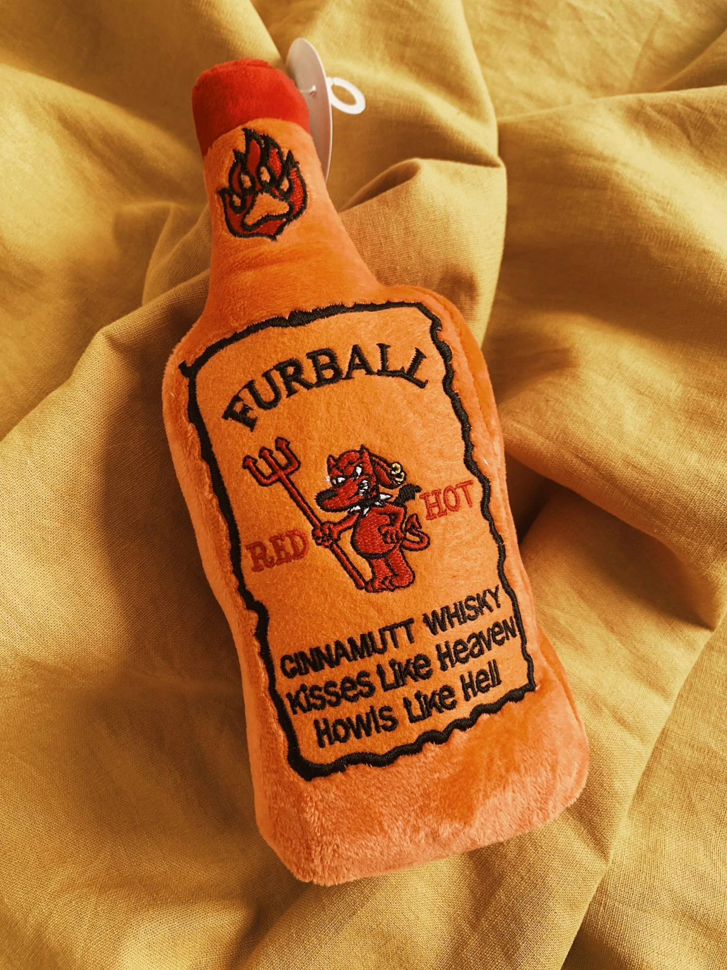 Furball cinnamutt whisky, a brand new addition to our muttini bar collection of fun and unique plush dog toys. Go ahead and give this cute new toy a shot! Lick it! Love it! Squeak it! Furball cinnamutt whisky toy is made of soft plush with a squeaker inside.