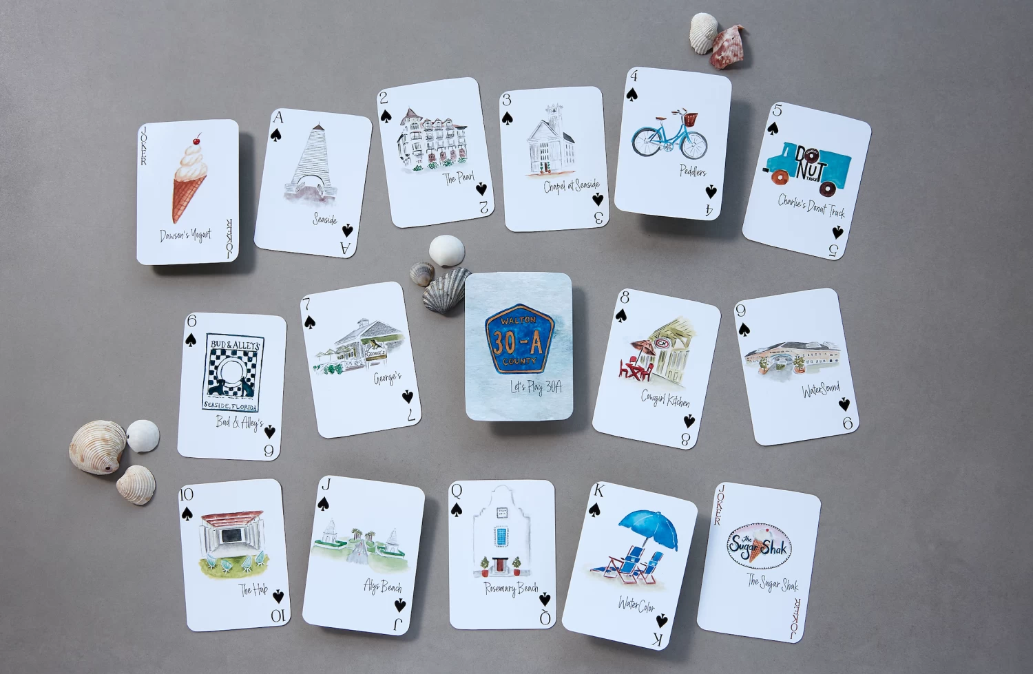 30A, Florida themed playing cards featuring 17 different unique watercolor images. Including Seaside, The Pearl Hotel, the Seaside Chapel, Bikes, Charlie’s Donut Truck, Bud & Alley’s, George’s, Cowgirl Kitchen, WaterSound, The Hub, Alys Beach, Rosemary Beach, WaterColor, Dawson’s Yogurt and The Sugar Shak.