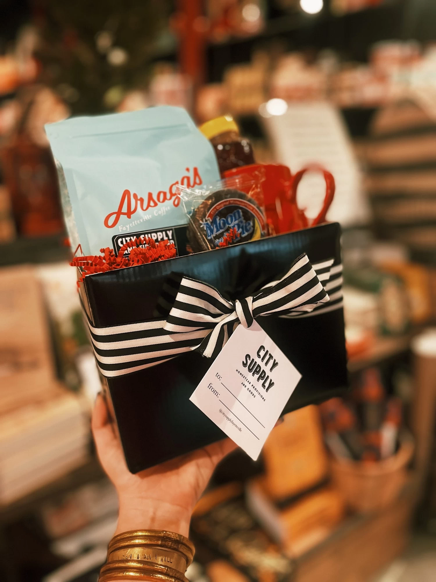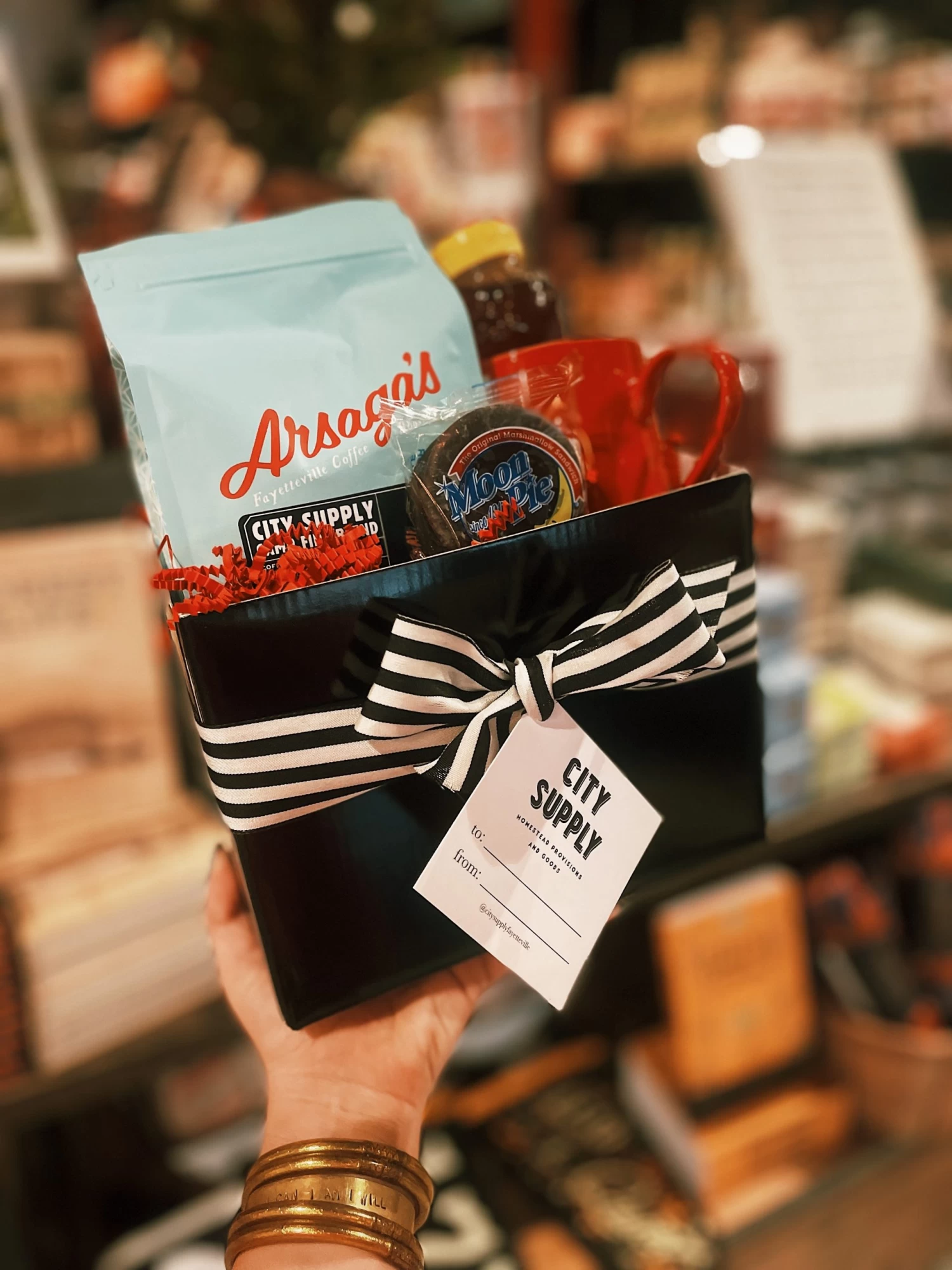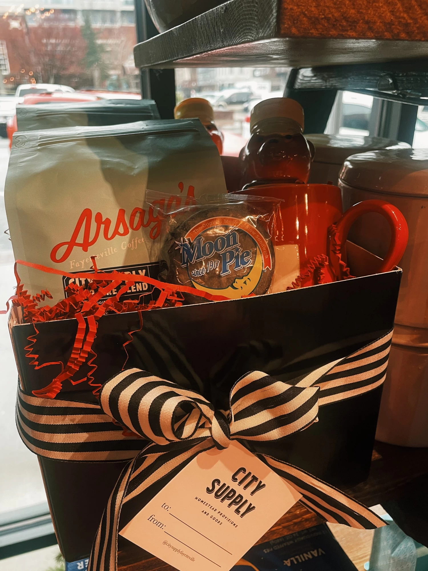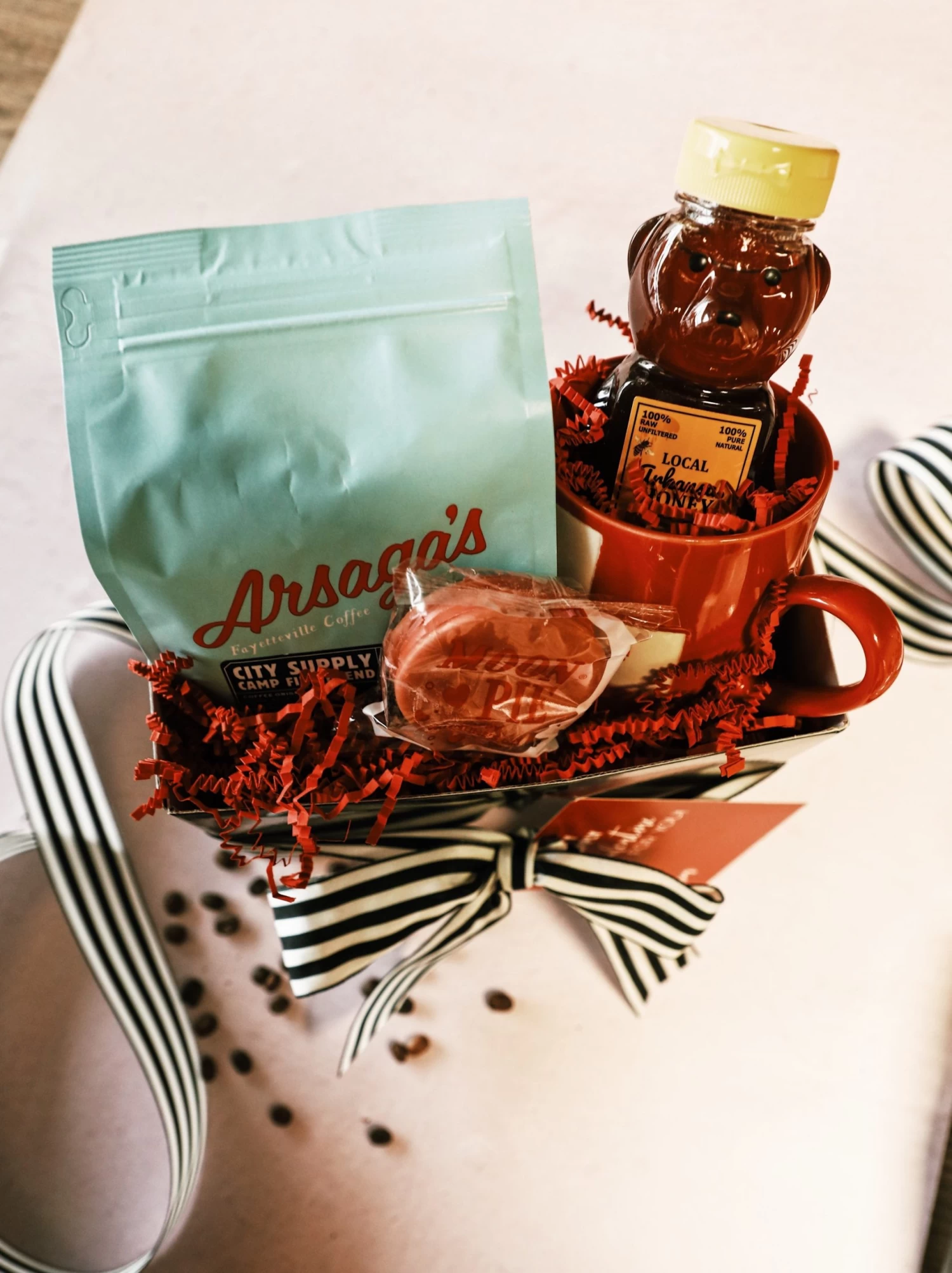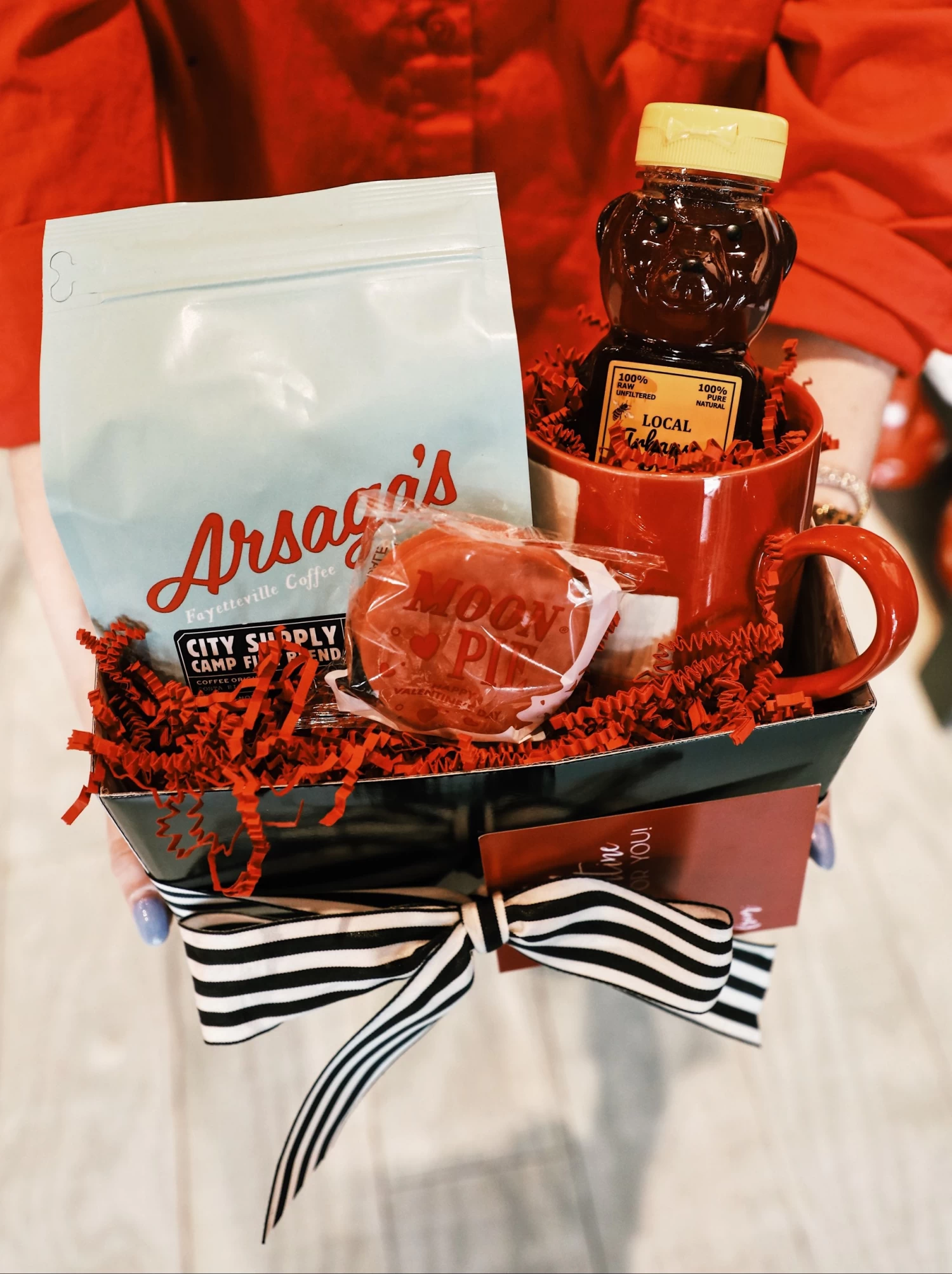 The Local Love Gift Set includes an Arsaga’s x City Supply Campfire Blend Coffee, an Arkansas Honey, a Red Swiss Cross Mug, and a Chocolate Mini Moonpie!