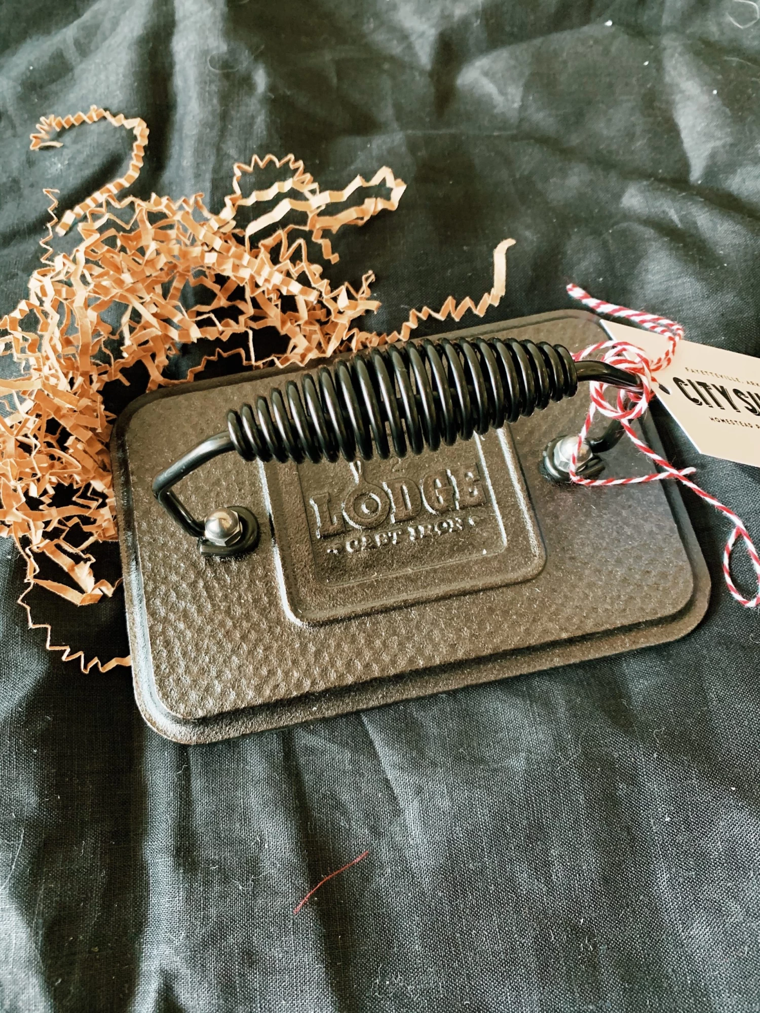 On the stovetop or grill, this grill press is perfect for eliminating curl from bacon or ham, pressing unwanted fats from your burgers or sausages, and holding heat in your grilled sandwiches. The heavy-duty cast iron base has a unique hammered finish and features a safe cool-grip spiral handle. Seasoned and ready to use.