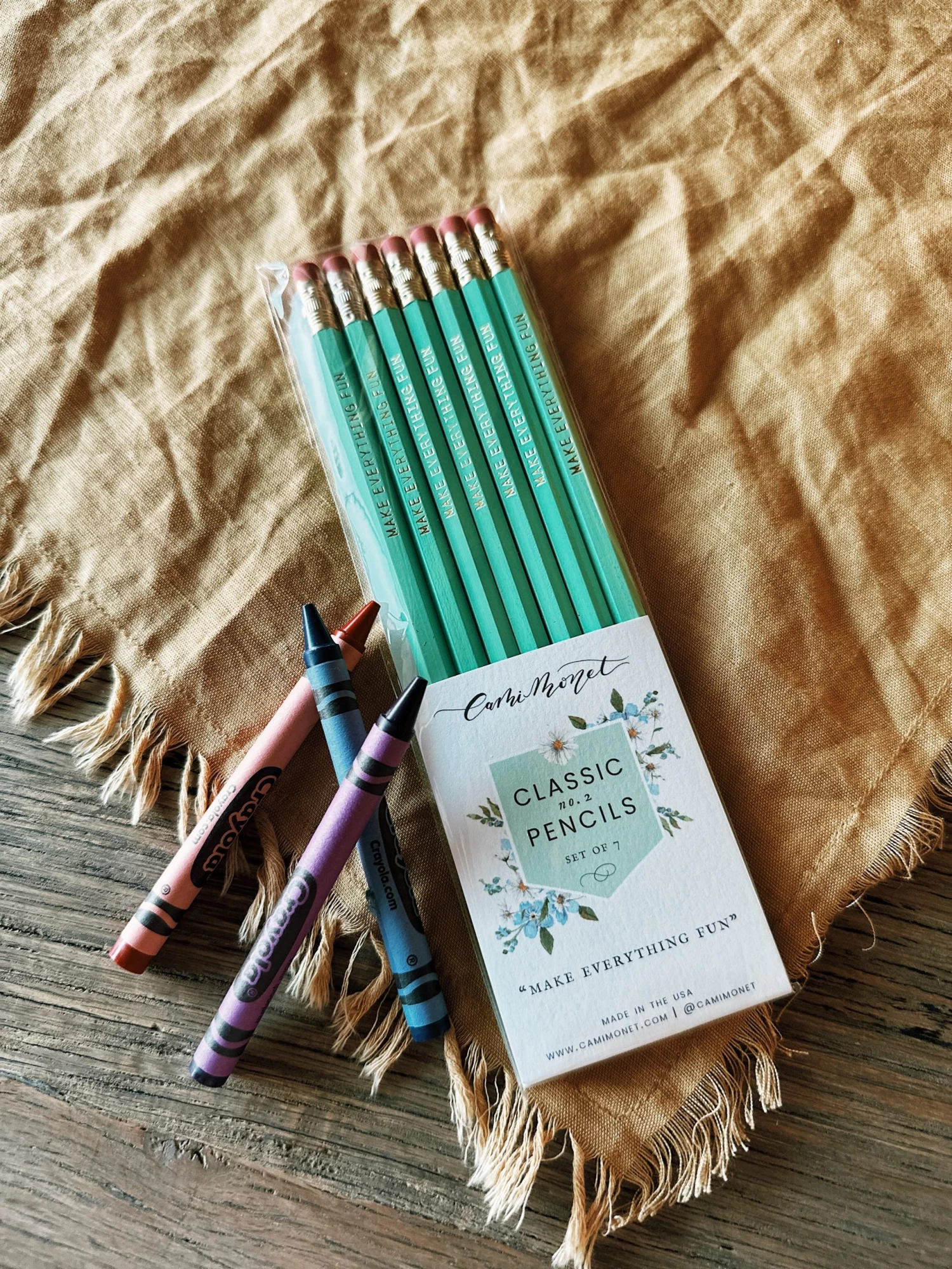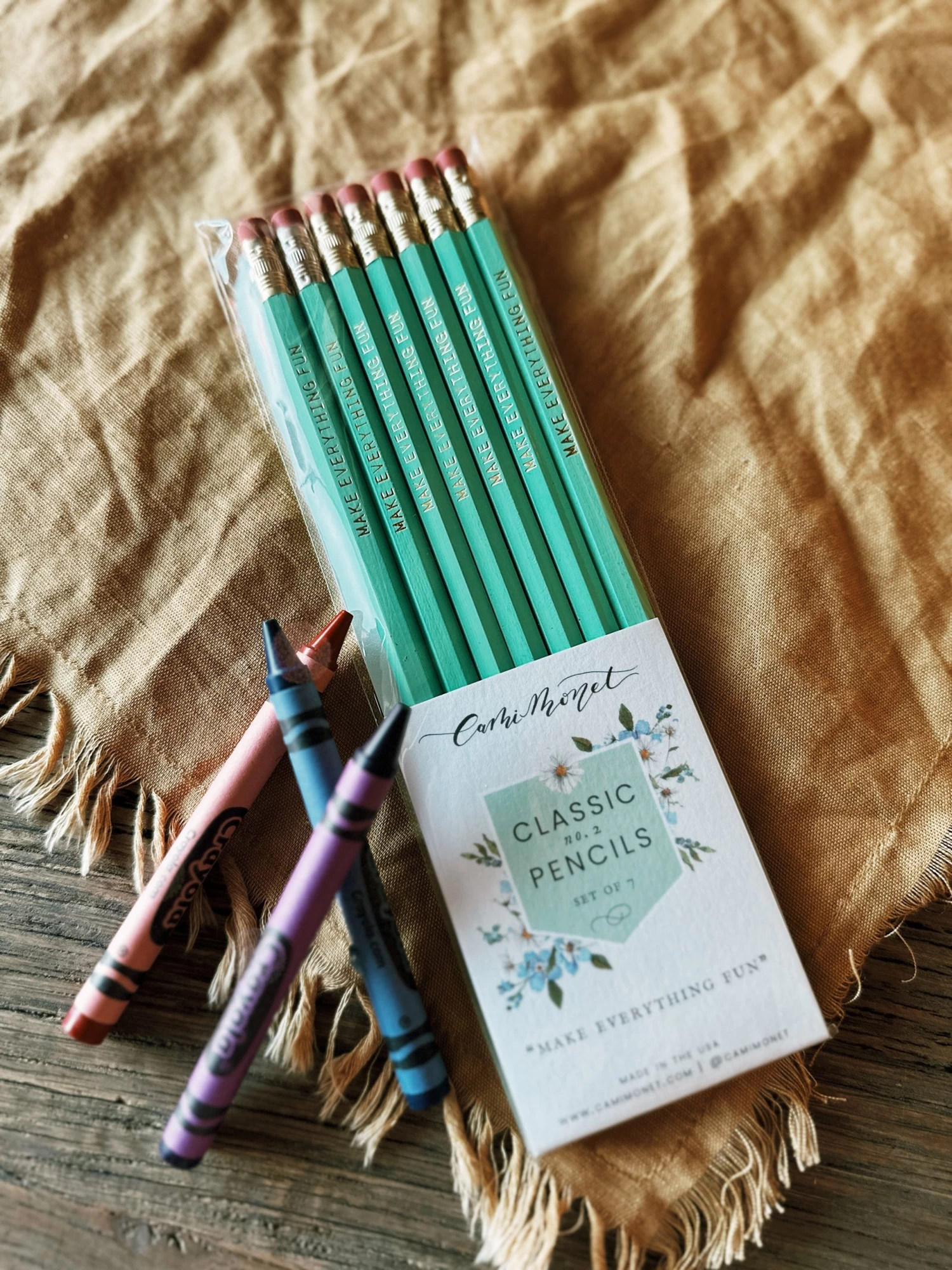 Set of 7 no. 2 cedar wood pencils Gold foil lettering Unsharpened Beautifully packaged and ready for gifting