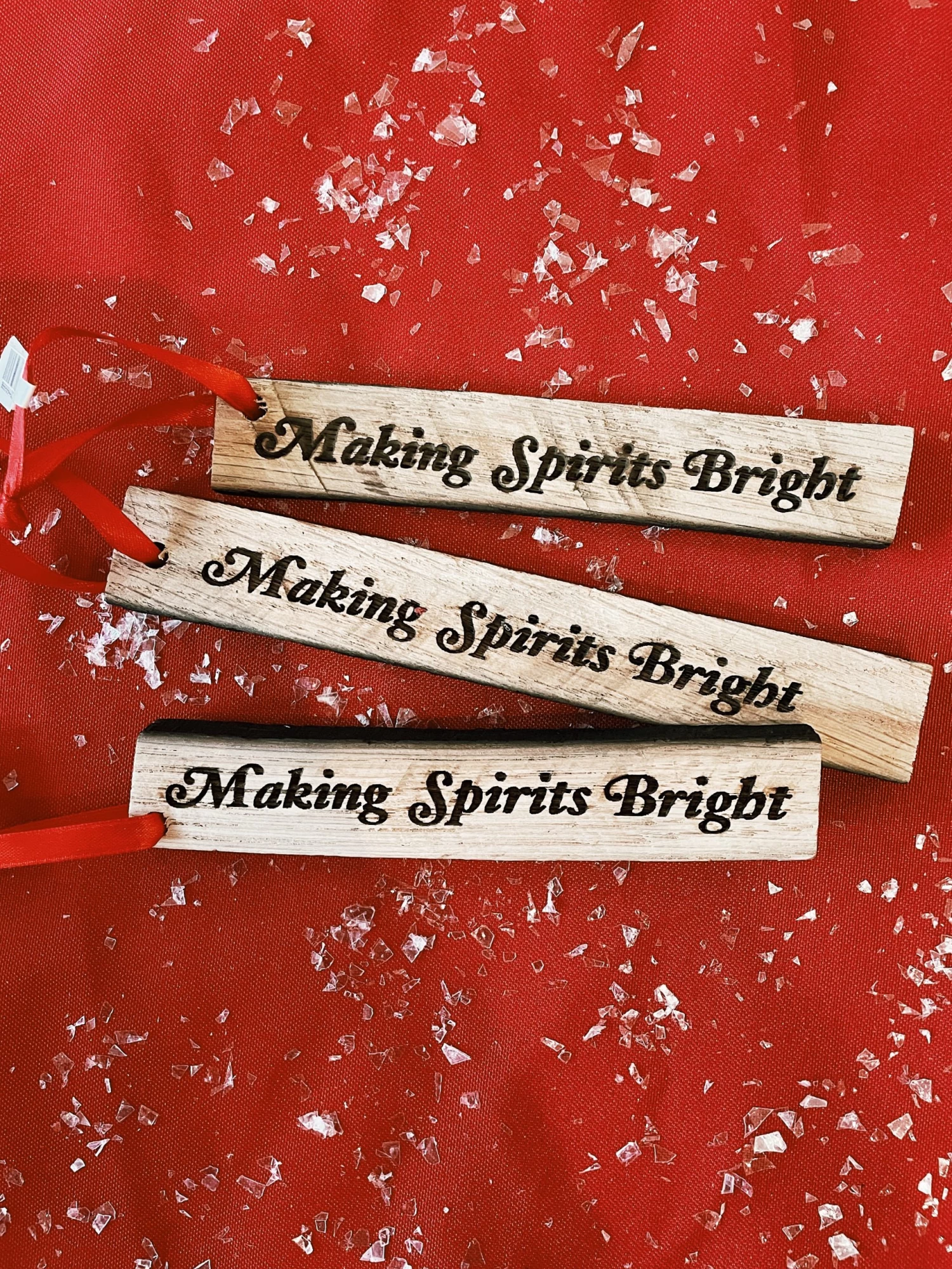 Our Pappy Van Winkle bourbon barrel stave ornaments are authentic pieces of Pappy Van Winkle barrels and engraved with “Making Spirits Bright”. Due to the nature of the barrel and staves, no two will be alike and wood imperfections will be present. They are unique as you can still smell the bourbon it once aged! They come packed in a hanging poly bag for easy display. Limited supply.