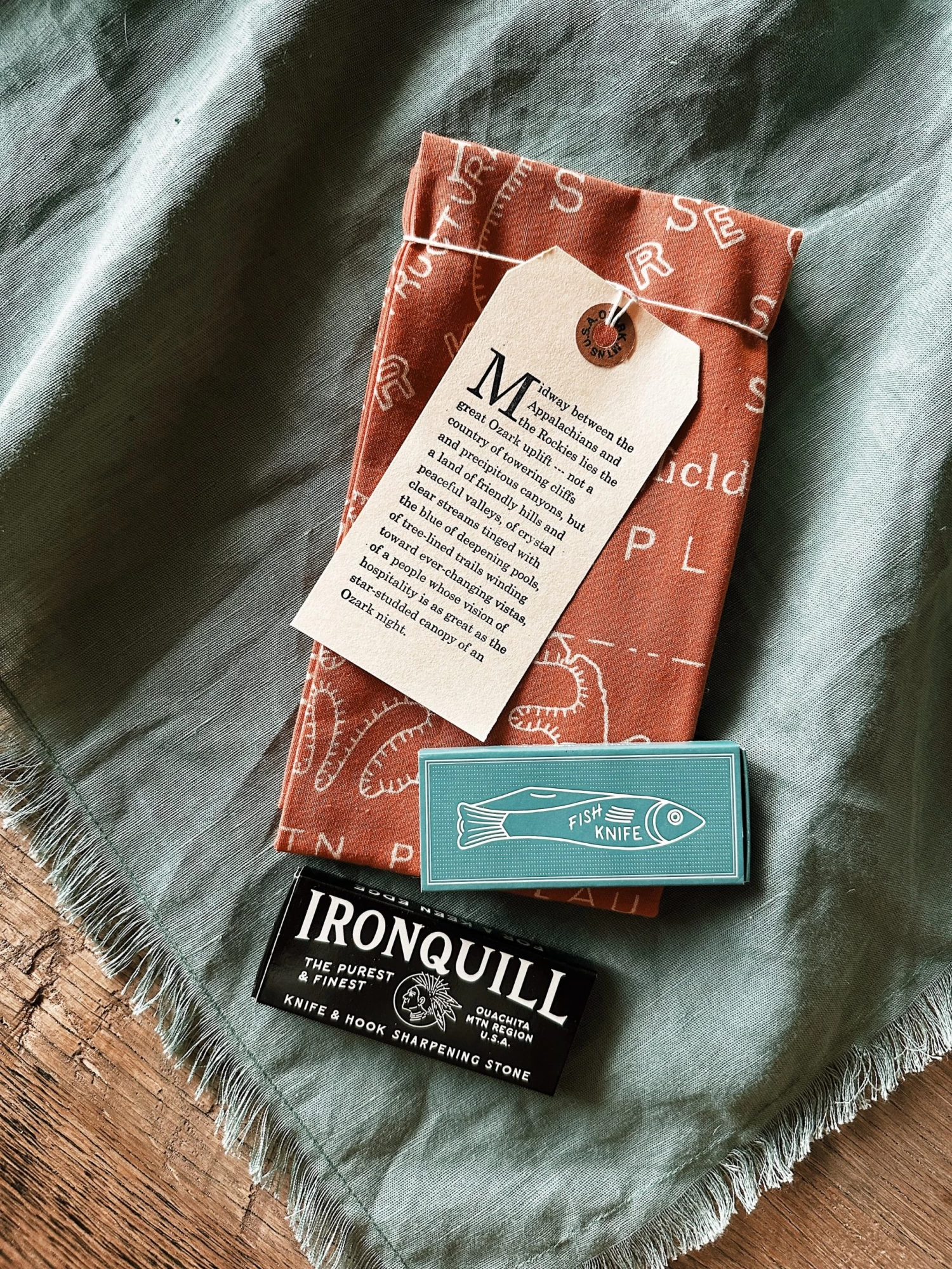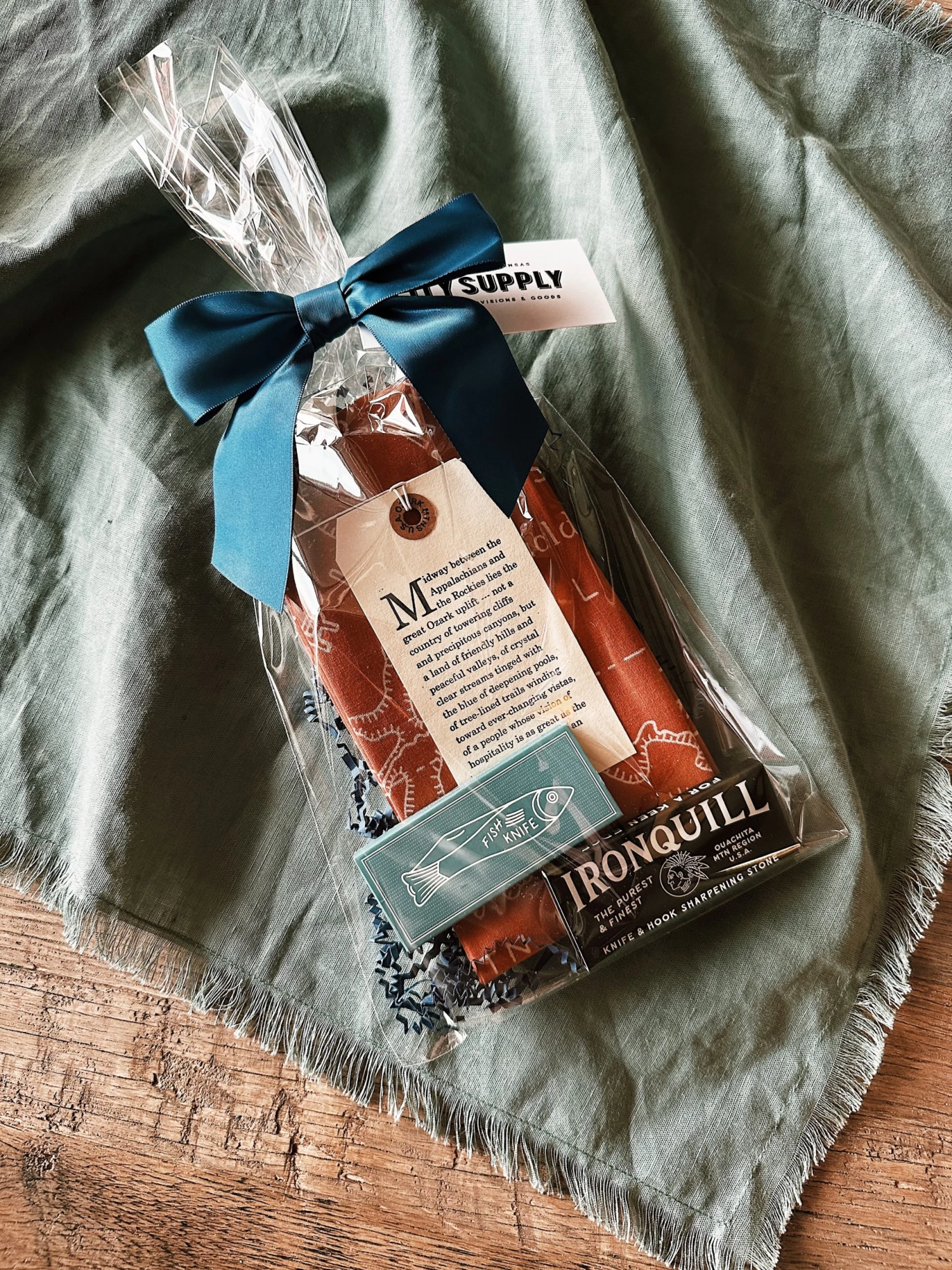 Our Mollyjogger gift set includes a Fingerling Fish Knife, Hook + Knife Sharpening Stone, and a Harvest Ozark 1900 Bandana. Each gift set comes wrapped in a cellophane bag with a bow! Perfect for easy gift giving!