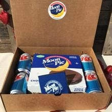 Our Party in a box has 4 cans of RC cola’s, a box of single decker pies and a MoonPie koozie for your RC’s and it is sealed with a MoonPie logo sticker!