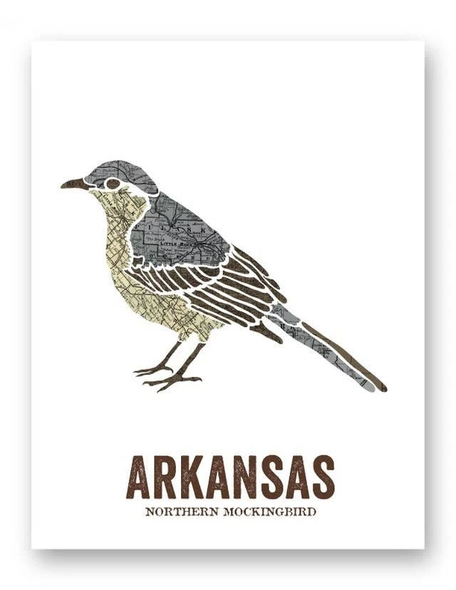 The Northern Mockingbird is a stunning bird that is the state bird of Arkansas. This poster is created using a Arkansas state map and therefore has a unique, vintage feel to it.