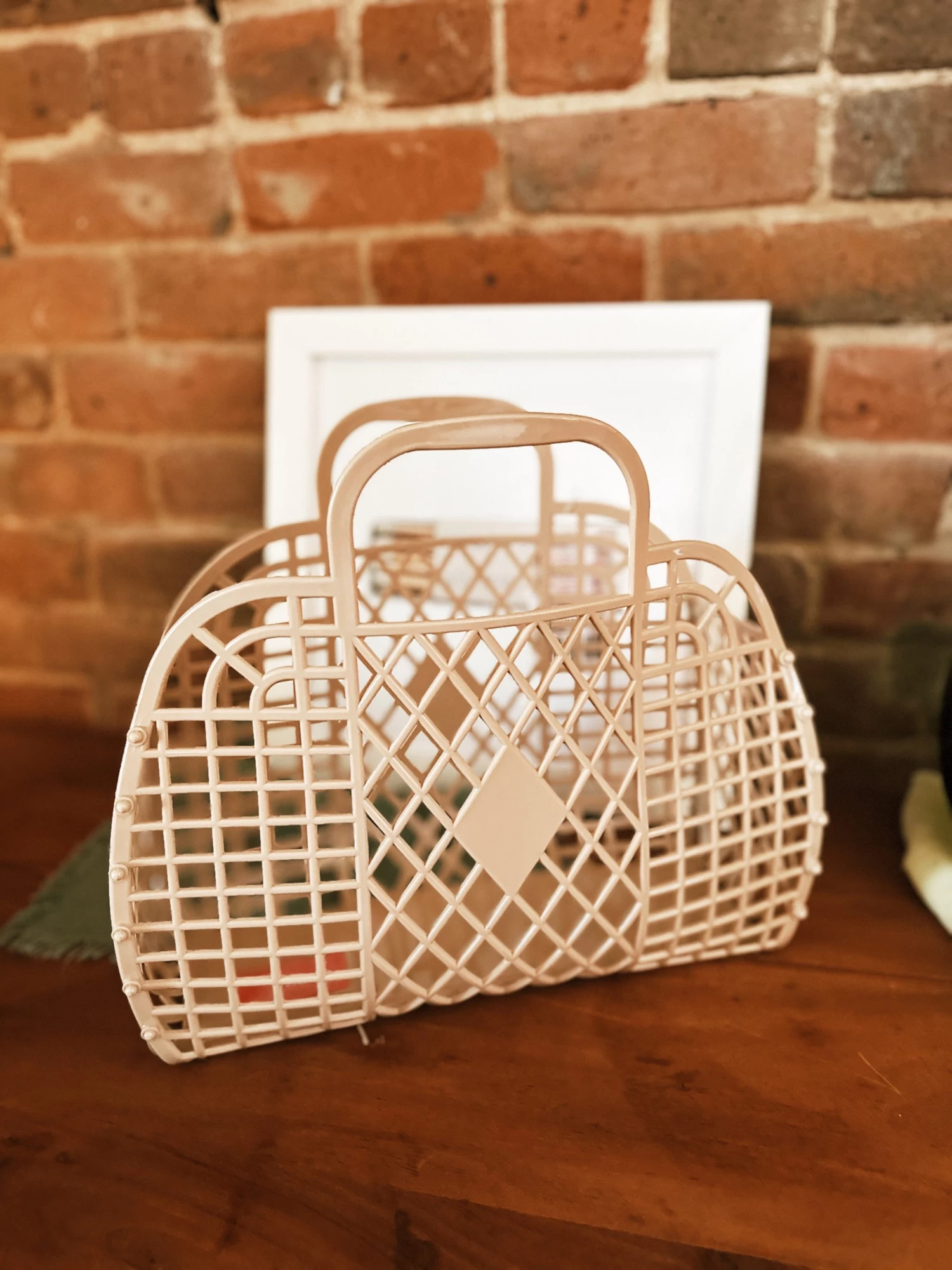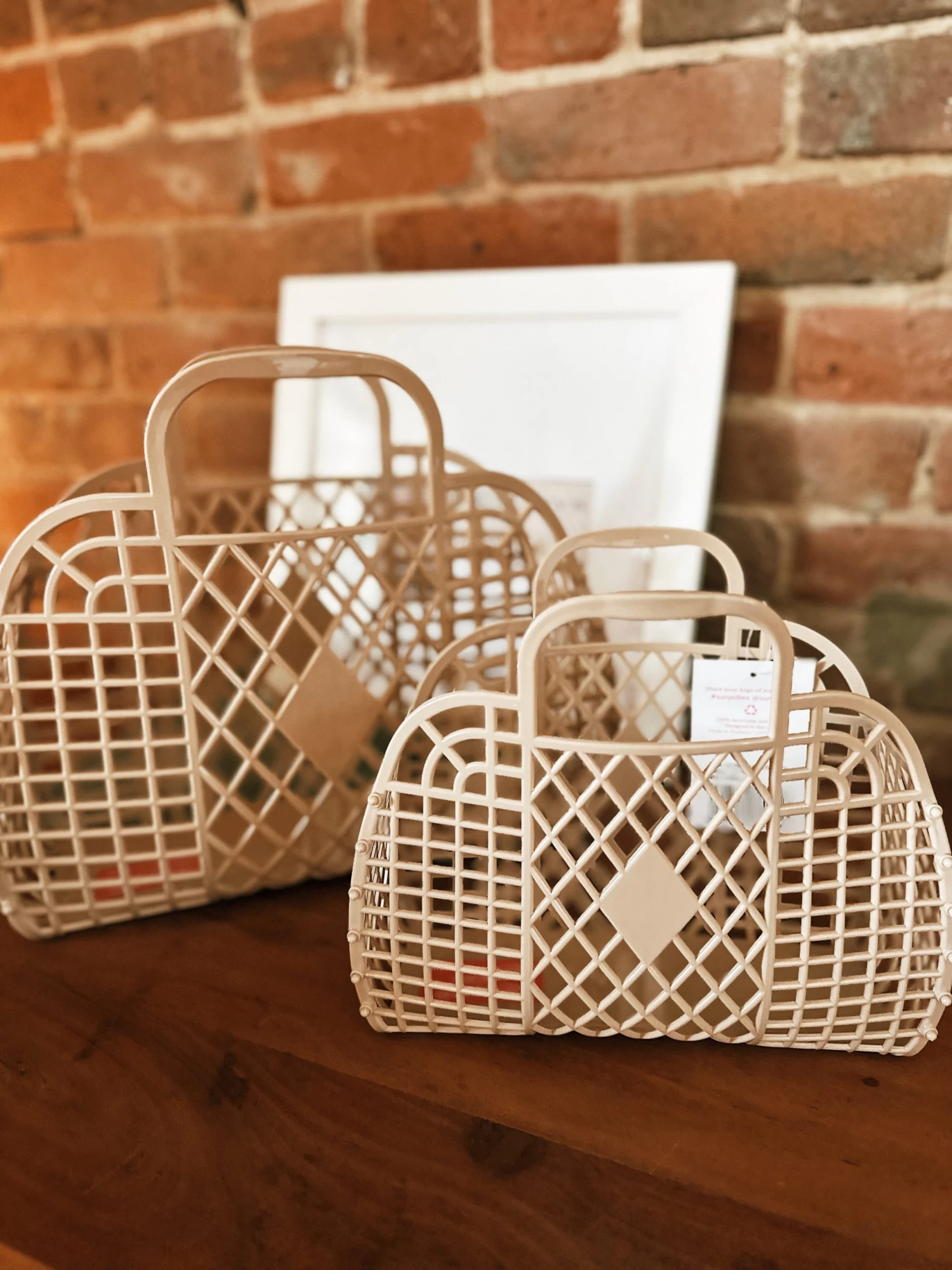 Sun Jellies’ original classic jelly bag, famous in Europe and America. Ideal for summer the large Retro Basket will hold all your daytime essentials – très chic and practical! It’s also a great size for carrying groceries, a knitting project or your kid’s beach toys. With ergonomic handles for comfy carrying it is shipped flat for easy assembly at home and can be gently undone by pushing the buttons back through. The perfect accessory for your holiday suitcase!