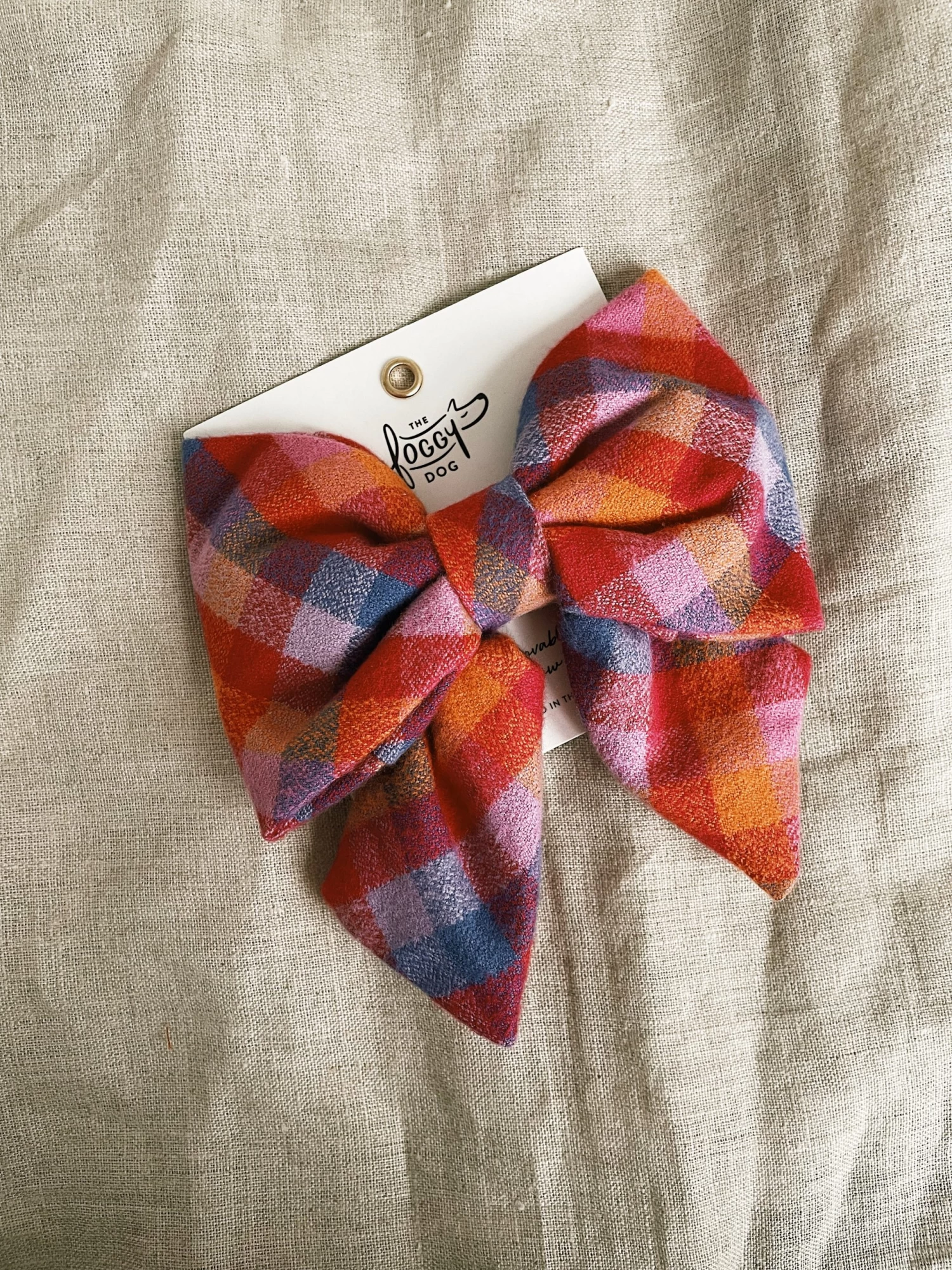 This flannel bow for girl dogs features warm jewel tones in purple, pink, and orange. Attaches to most standard-width collars with elastic loops. Two loops for added stability (no more bow tie droop!)