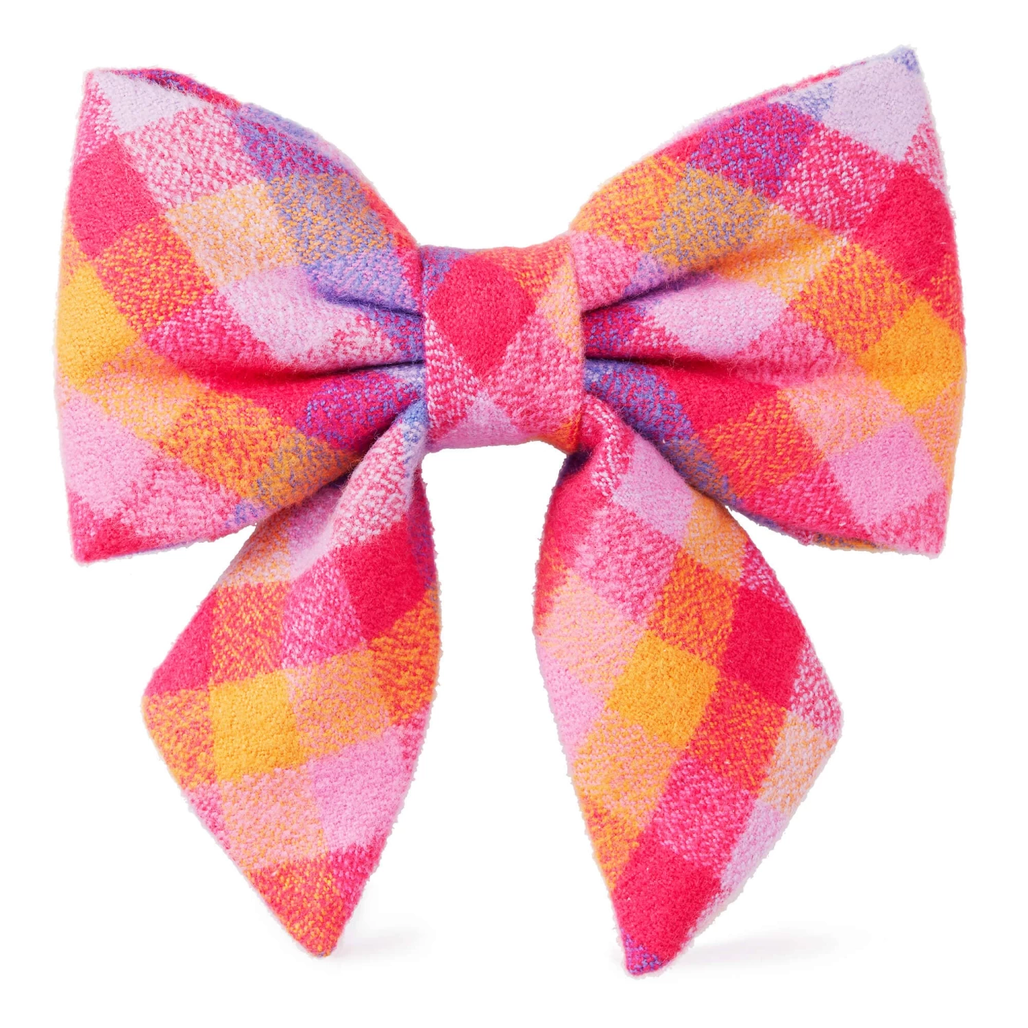 This flannel bow for girl dogs features warm jewel tones in purple, pink, and orange. Attaches to most standard-width collars with elastic loops. Two loops for added stability (no more bow tie droop!)