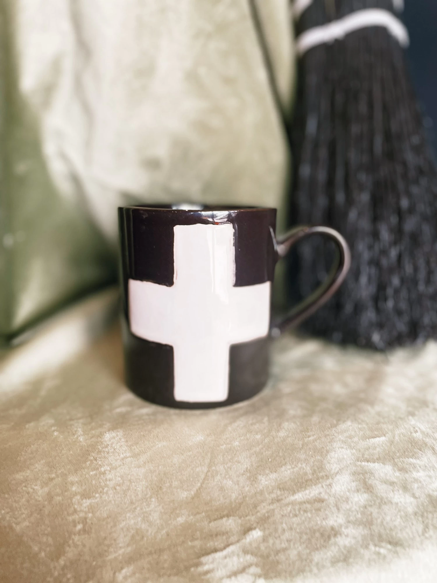 3″ Round x 4″H 8 oz. Handmade Stoneware Mug w/ Wax Relief Swiss Cross, 4 Colors (Each One Will Vary)