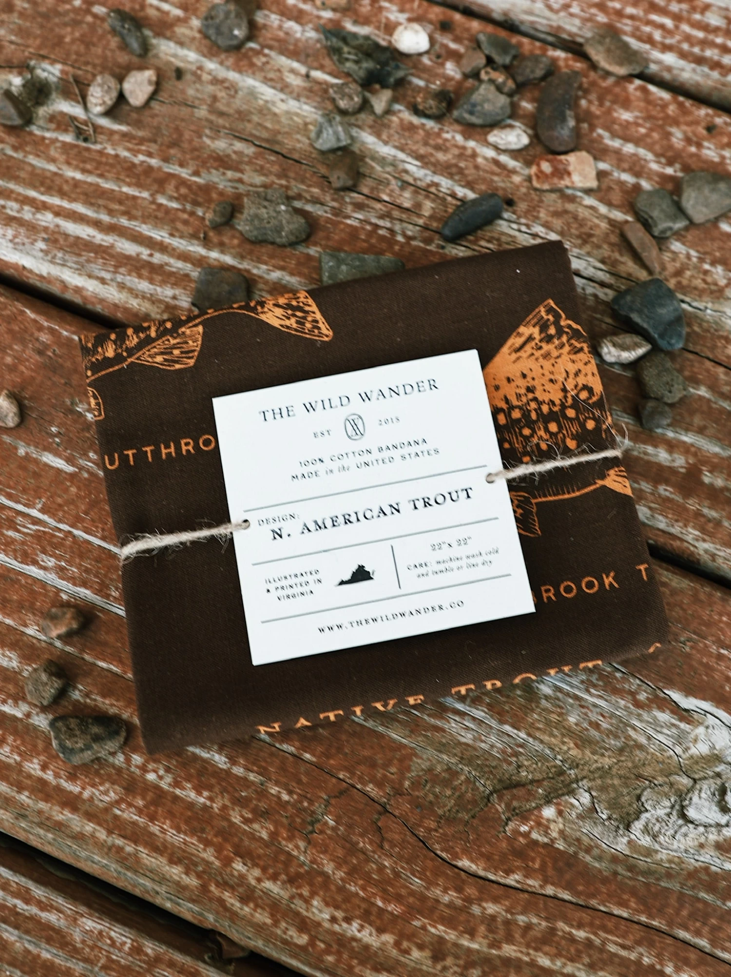 A bandana featuring illustrations of trout native to the United States, including Southern Appalachian Brook Trout, Yellowstone Cutthroat, and Colorado River Cutthroat. The Wild Wander bandanas are proudly illustrated and printed in Virginia on a 100% cotton bandana made in the United States. These make the perfect accessory for you or your four legged friend’s next wander.