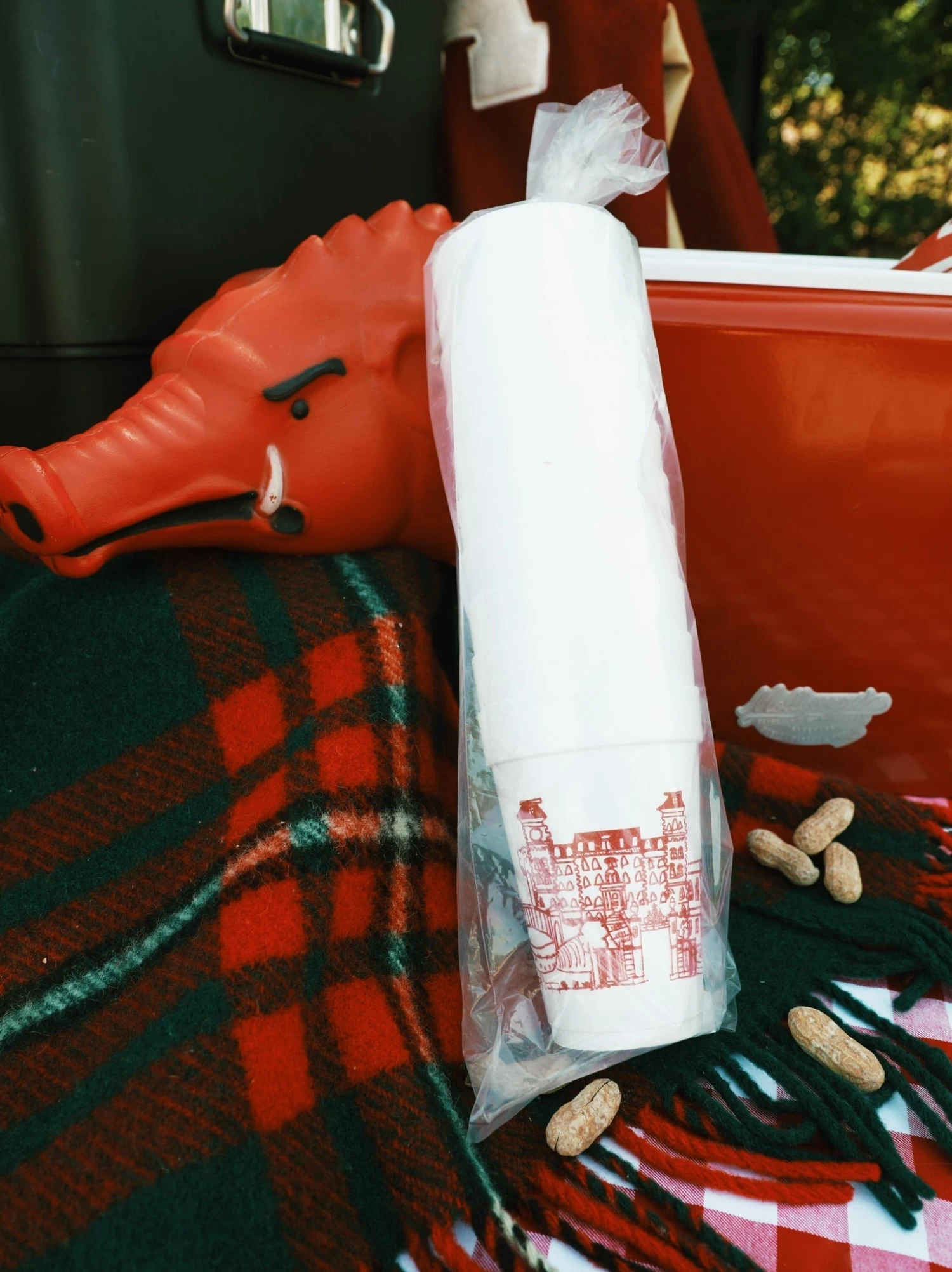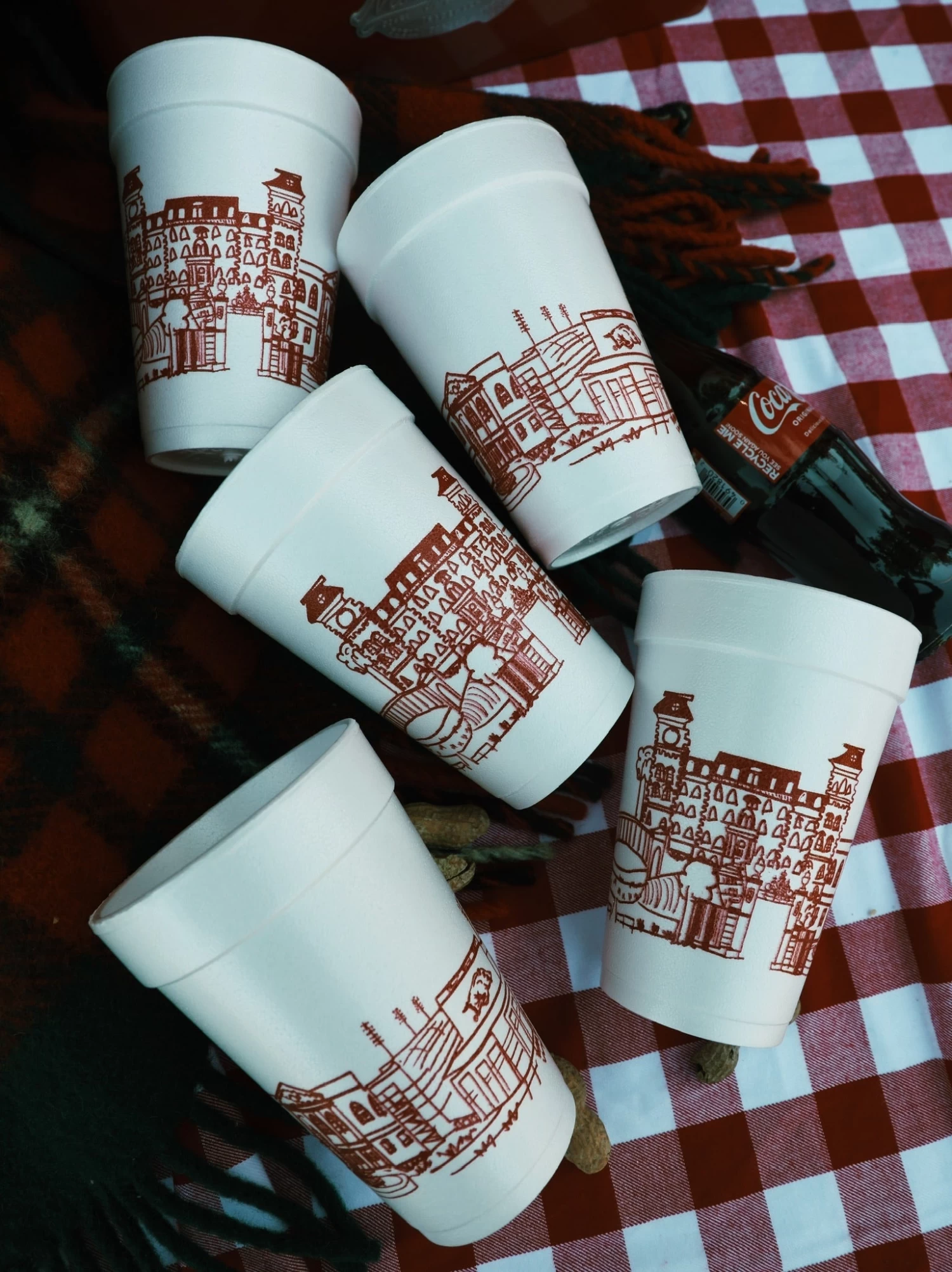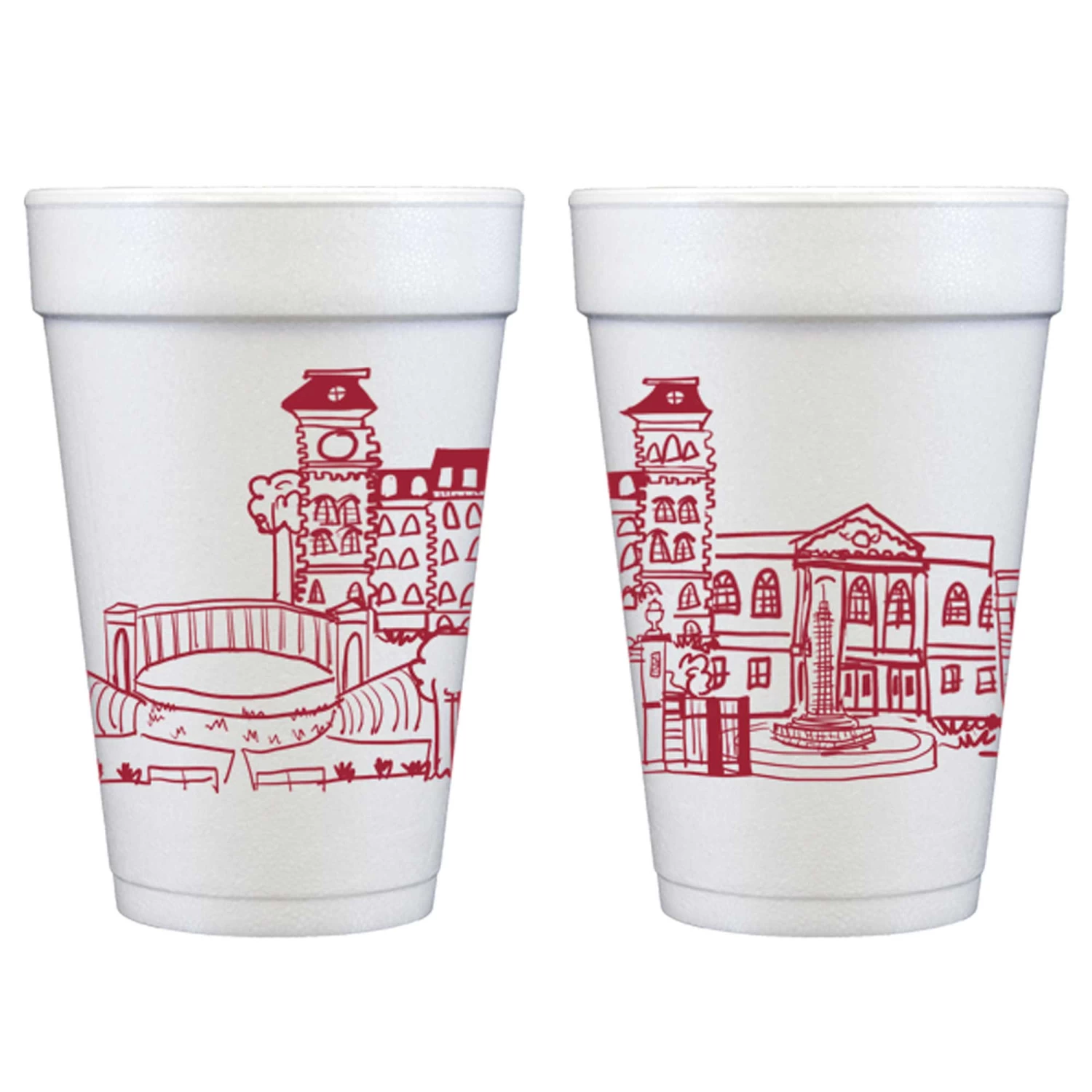 Our hand-drawn foam cups show landmarks of the University of Arkansas campus in Fayetteville, Arkansas. Printed in red ink these make a great tailgate cup graduation party cup.