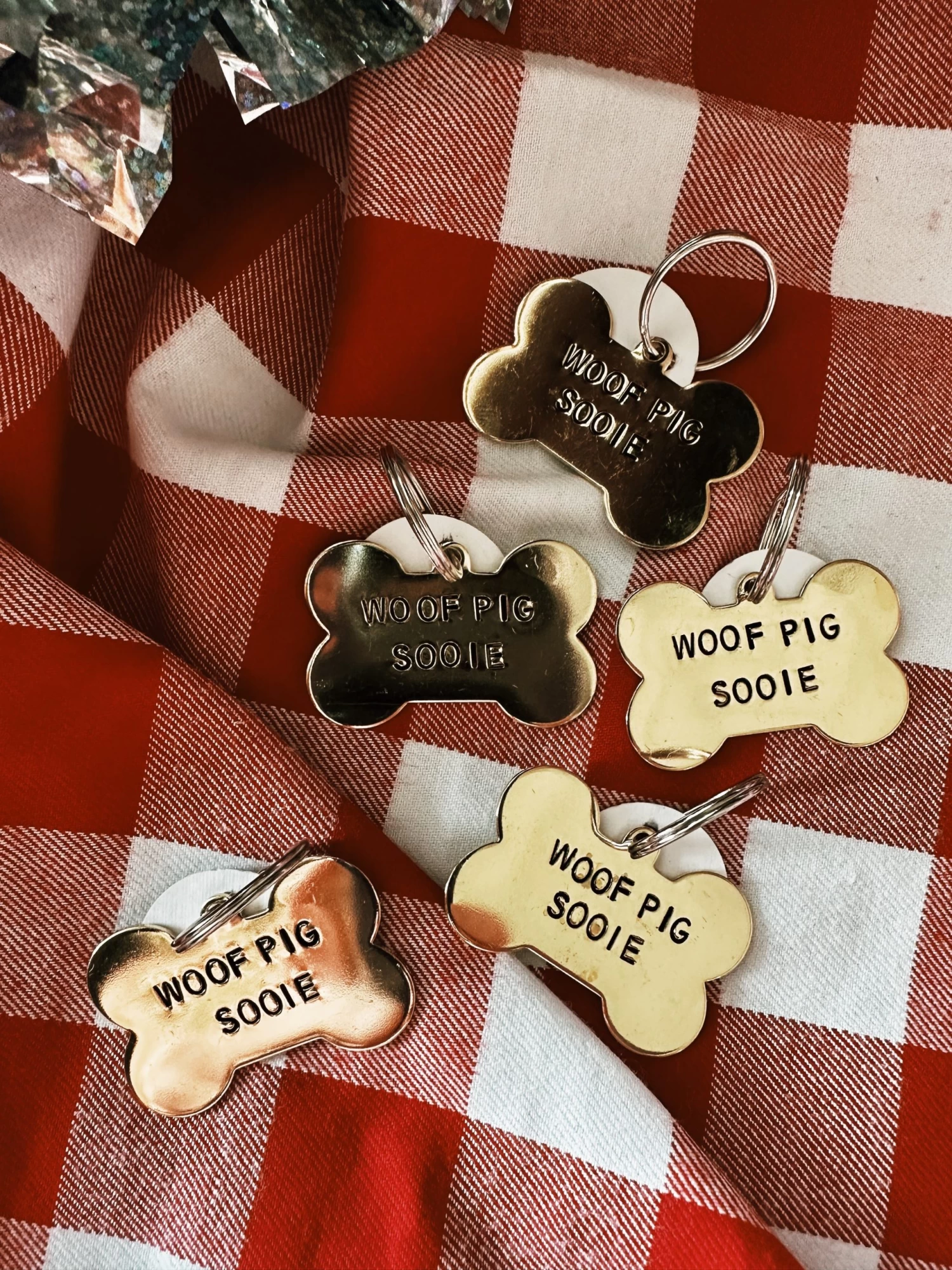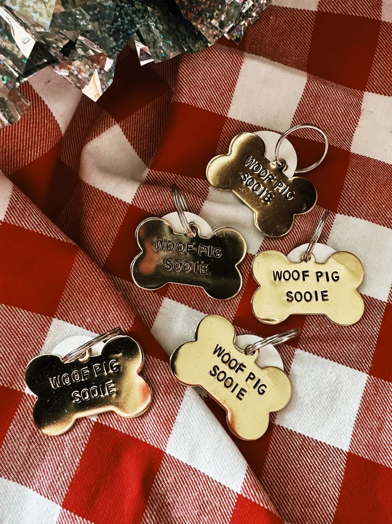 This is an awesome bone-shaped pet tag hand-stamped with the text, “WOOF PIG SOOIE”. Ready to call those Hogs!